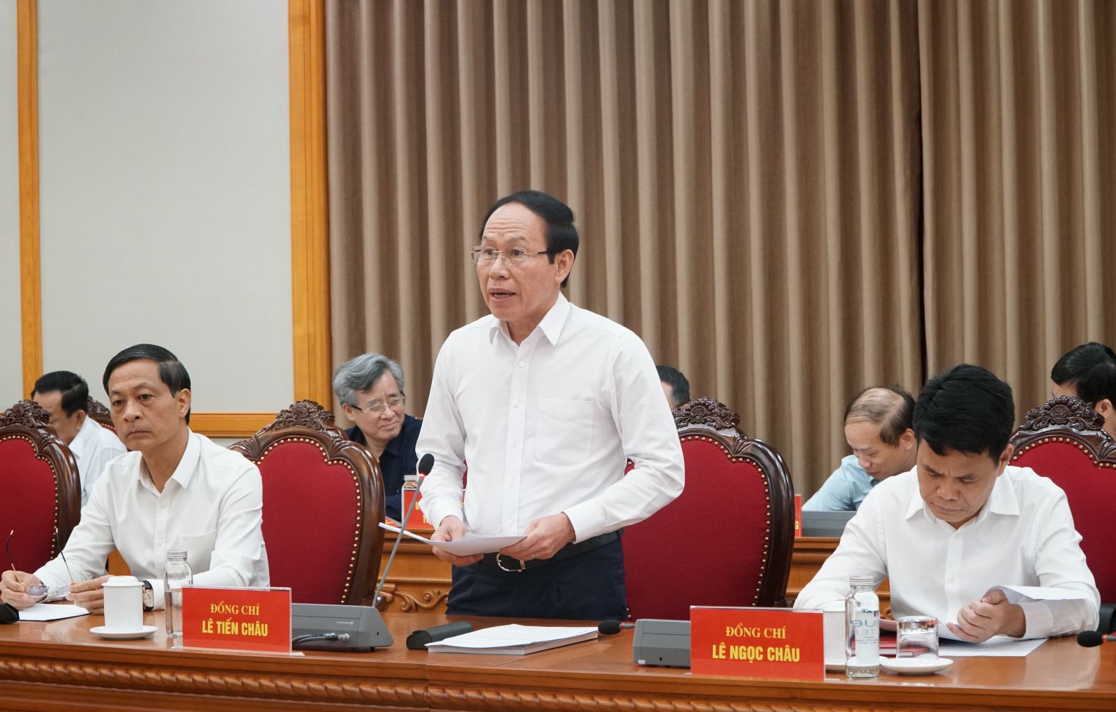 Đồng chí Lê Tiến Châu, Ủy viên Trung ương Đảng, Bí thư Thành ủy Hải Phòng báo cáo tại buổi làm việc.