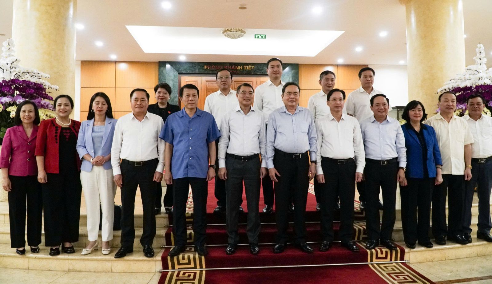 Đồng chí Trần Thanh Mẫn và các đồng chí Ủy viên Bộ Chính trị, Bí thư Trung ương Đảng chụp ảnh lưu niệm cùng Ban Thường vụ Tỉnh ủy Bắc Ninh.