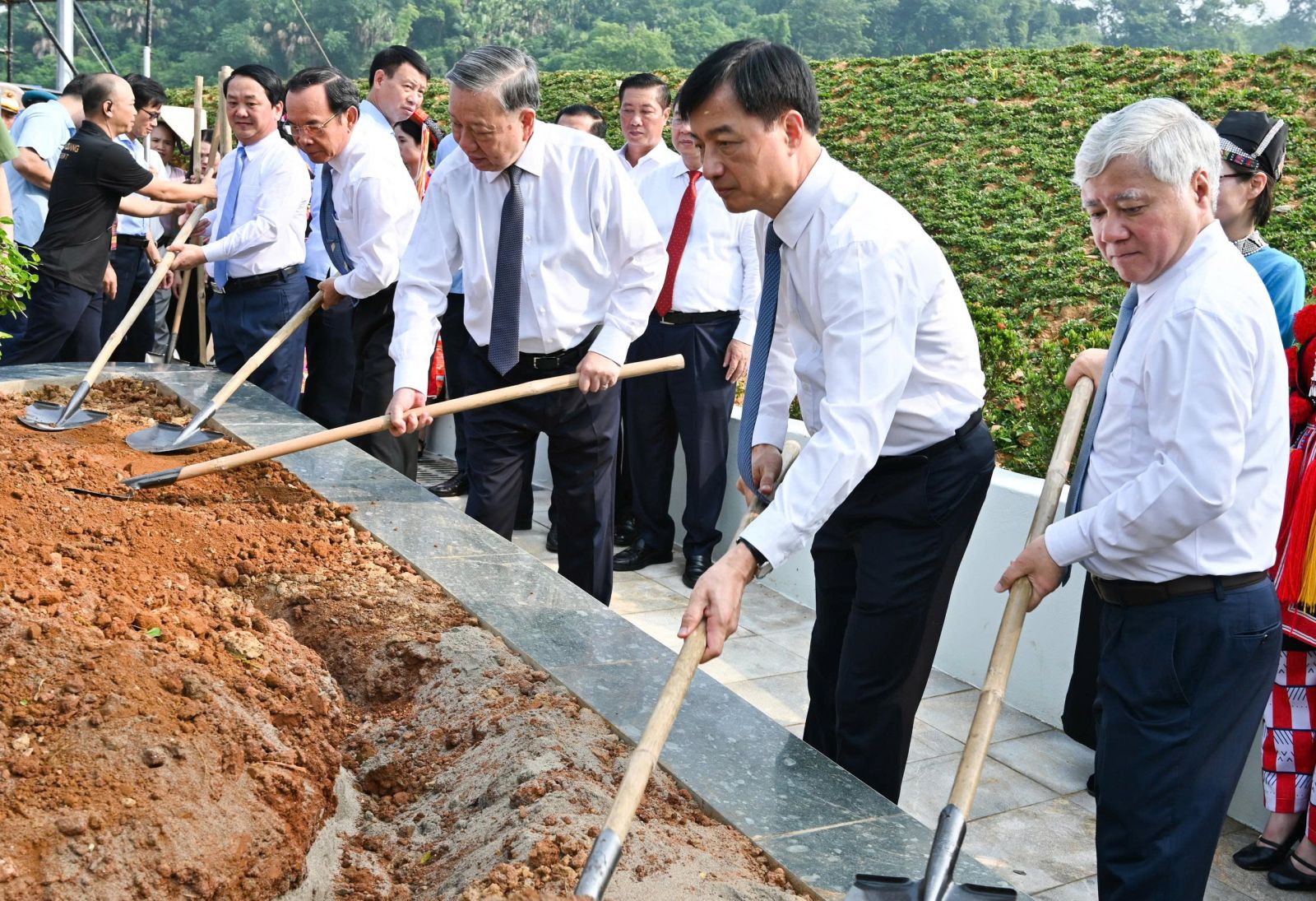 Tổng Bí thư Tô Lâm và Đoàn công tác trồng cây lưu niệm tại khu di tích Tân Trào.