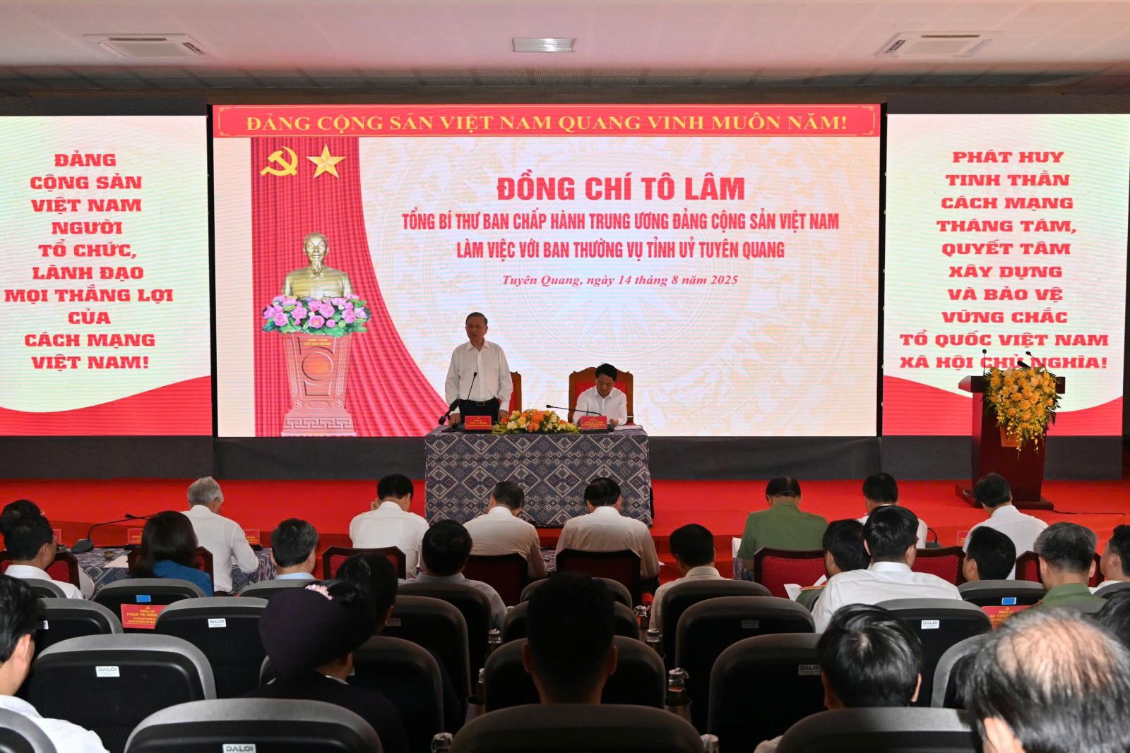 Tổng Bí thư Tô Lâm phát biểu tại buổi làm việc với Lãnh đạo Tuyên Quang.