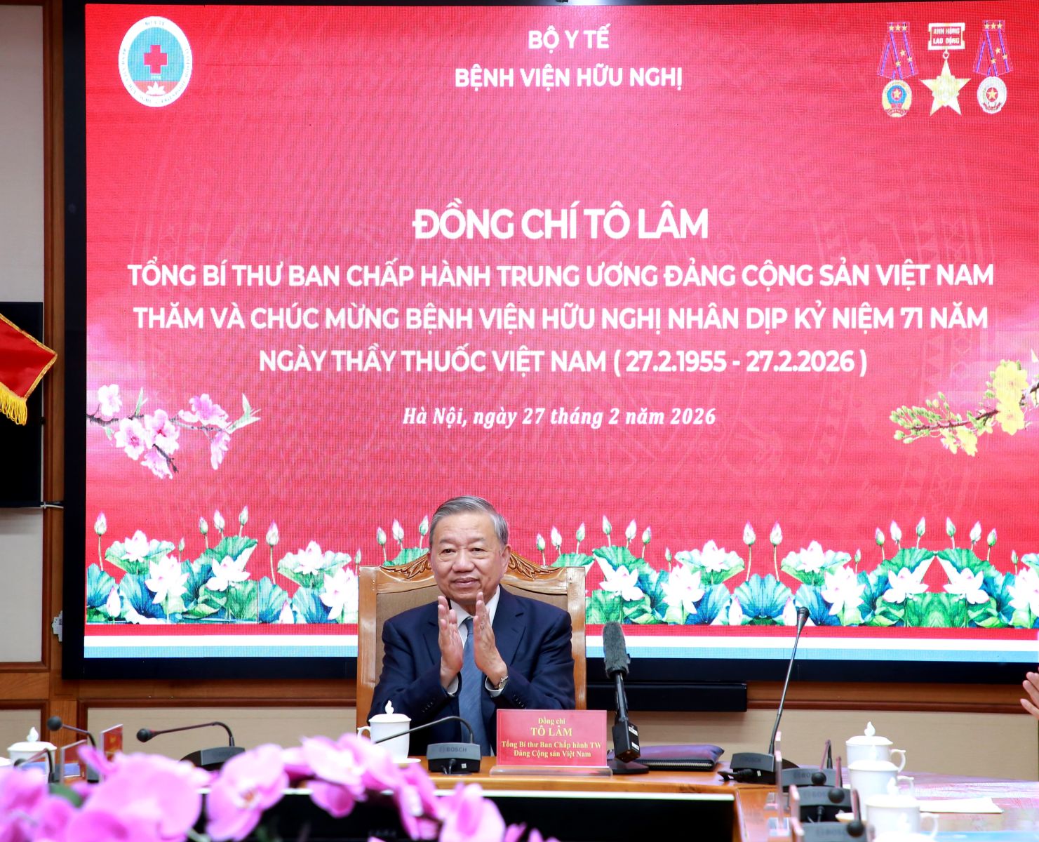 (ĐCSVN) - Trong không khí ấm áp của mùa xuân Bính Ngọ, với khí thế, niềm tin và khát vọng phát triển đất nước trong kỷ nguyên mới, chiều 27/2, Tổng Bí thư Tô Lâm đã đến thăm, chúc mừng Ngành Y tế và tập thể cán bộ, y bác sĩ, nhân viên Bệnh viện Hữu Nghị nhân dịp kỷ niệm 71 năm Ngày Thầy thuốc Việt Nam (27/2/1955 – 27/2/2026).