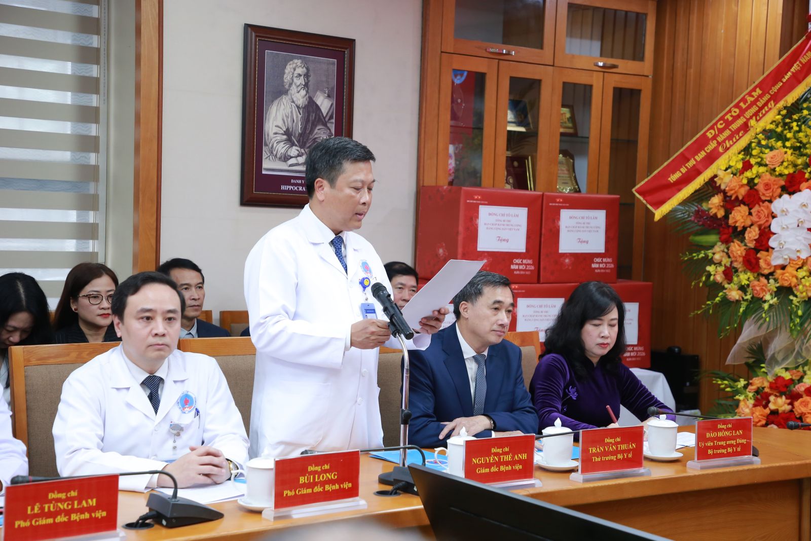 Đồng chí Nguyễn Thế Anh, Bí thư Đảng ủy, Giám đốc Bệnh viện Hữu Nghị báo cáo tại cuộc gặp mặt.