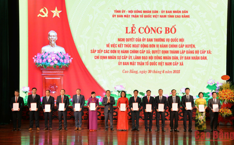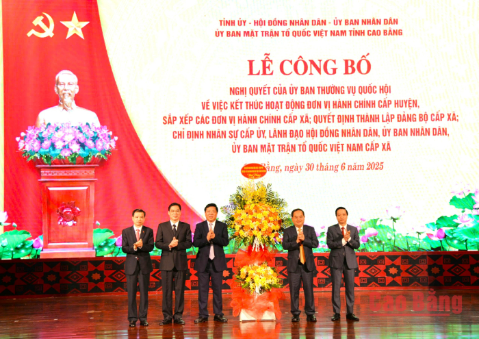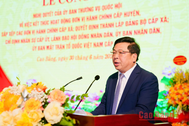 Tại buổi lễ, Phó Bí thư Thường trực Tỉnh ủy Vũ Hồng Quang công bố Nghị quyết số 1657/NQ-UBTVQH15, ngày 16/6/2025 của Ủy ban Thường vụ Quốc hội về việc sắp xếp các ĐVHC cấp xã của tỉnh năm 2025. Theo đó, trên cơ sở Đề án số 383/ĐA-CP ngày 9/5/2025 của Chính phủ về sắp xếp ĐVHC cấp xã của tỉnh Cao Bằng năm 2025, Ủy ban Thường vụ Quốc hội quyết định sắp xếp để thành lập các ĐVHC cấp xã của tỉnh; sau sắp xếp tỉnh Cao Bằng có 56 ĐVHC cấp xã (53 xã, 3 phường); chính quyền địa phương ở các ĐVHC cấp xã hình thành sau sắp xếp chính thức hoạt động từ ngày 1/7/2025.