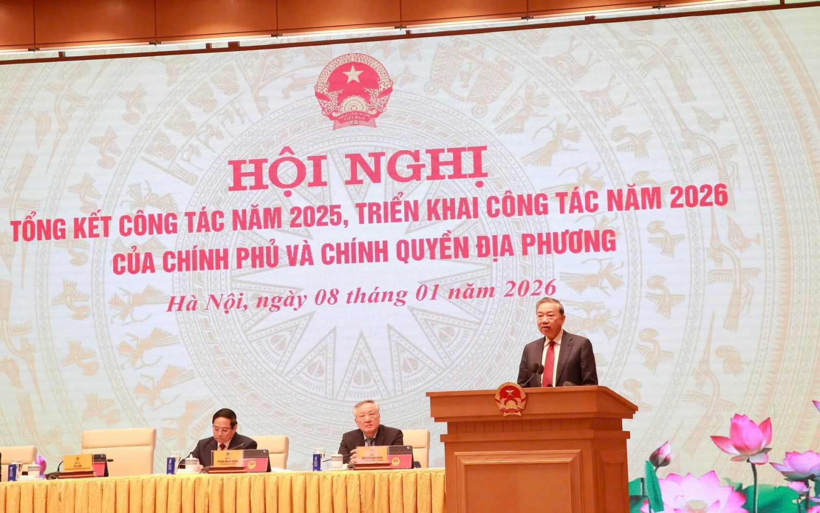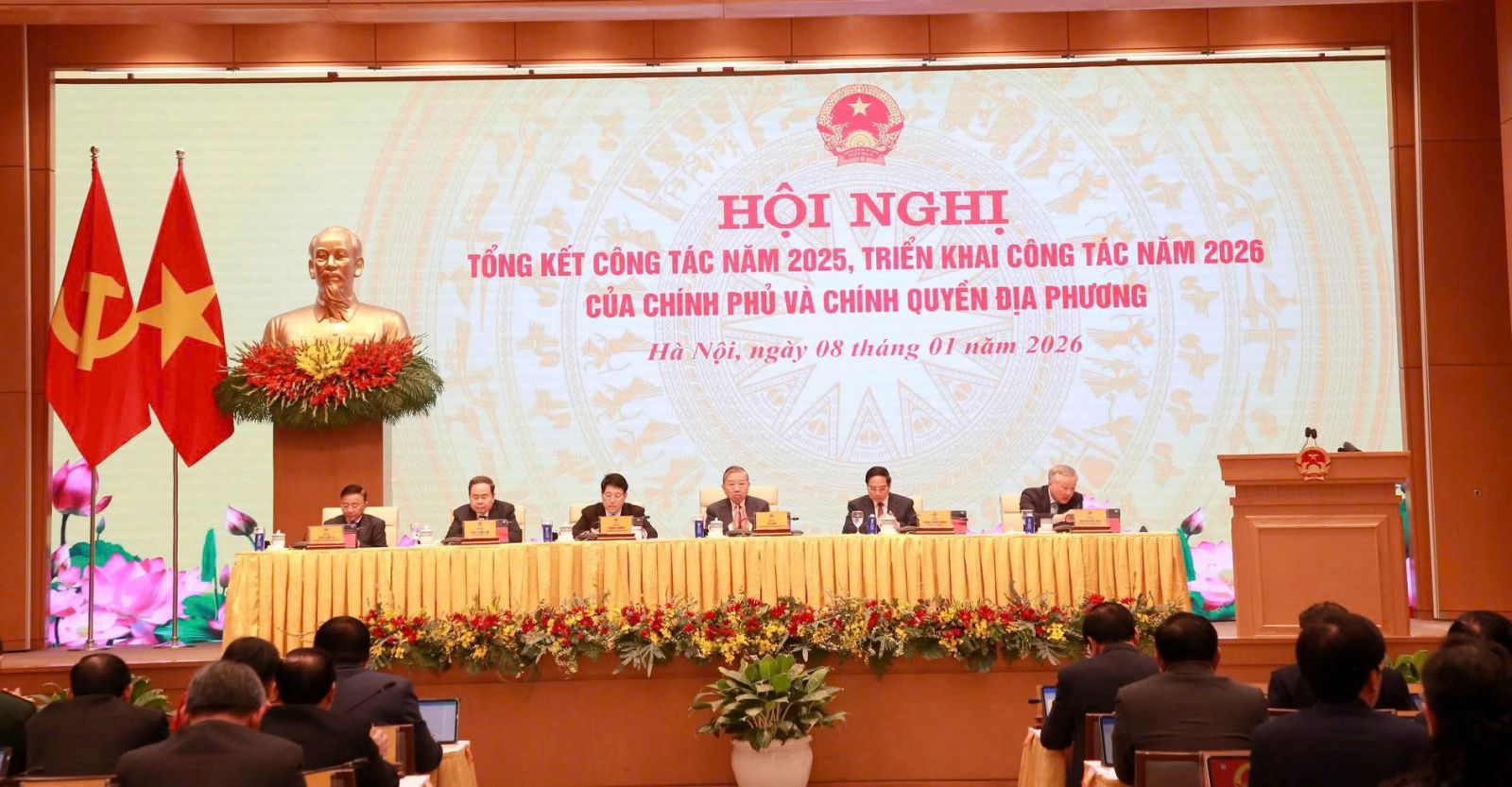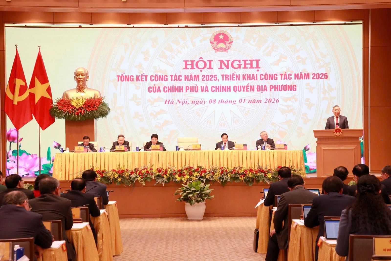 Sáng 8/1, Chính phủ tổ chức Hội nghị tổng kết công tác năm 2025, triển khai công tác năm 2026 của Chính phủ và chính quyền địa phương. Hội nghị được tổ chức trực tiếp tại Trụ sở Chính phủ kết hợp trực tuyến với điểm cầu 34 tỉnh, thành phố trong cả nước. Phát biểu chỉ đạo tại Hội nghị, thay mặt lãnh đạo Đảng và Nhà nước, Tổng Bí thư Tô Lâm nhiệt liệt hoan nghênh, ghi nhận, chúc mừng, biểu dương Chính phủ, Thủ tướng Chính phủ, các cấp ủy đảng, chính quyền, đoàn thể, cộng đồng doanh nghiệp, cán bộ, đảng viên, đồng bào, chiến sĩ cả nước và kiều bào ta ở nước ngoài về những nỗ lực phấn đấu và những kết quả, thành tích đã đạt được trong năm 2025 và giai đoạn 2021-2025.
