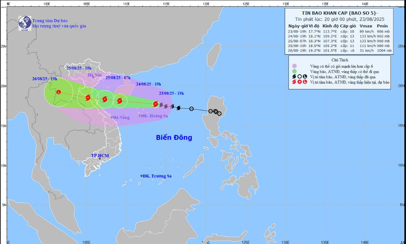 Theo dự báo của Trung tâm dự báo khí tượng thủy văn quốc gia (đến thời điểm hiện nay), chiều mai (ngày 24/8) bão di chuyển vào vùng biển từ Thanh Hóa đến Quảng Trị với sức gió mạnh cấp 12, giật cấp 14-15 và tiếp tục mạnh thêm.