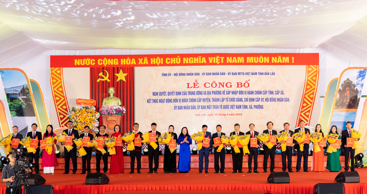 Tại buổi lễ, đồng chí Huỳnh Thị Chiến Hòa, Phó Bí thư Tỉnh ủy đã công bố các quyết định của hai tỉnh Đắk Lắk và Phú Yên, gồm: Quyết định của BCH Đảng bộ huyện về việc kết thúc hoạt động cấp xã (cũ); Quyết định của BCH Đảng bộ tỉnh về việc kết thúc hoạt động các đảng bộ cấp huyện (cũ); Quyết định của BCH Đảng bộ 2 tỉnh về thành lập 102 Đảng bộ các xã, phường (mới); Quyết định chỉ định nhân sự BCH, BTV, Bí thư, Phó Bí thư của 102 xã, phường; Quyết định chỉ định Ủy ban Kiểm tra, Chủ nhiệm, Phó Chủ nhiệm Ủy ban Kiểm tra các xã, phường; Nghị quyết chỉ định Chủ tịch, Phó Chủ tịch, Trưởng ban của HĐND của 102 xã, phường; Nghị quyết chỉ định Chủ tịch, Phó Chủ tịch UBND của 102 xã, phường; Quyết định của Ủy ban MTTQ Việt Nam tỉnh thành lập MTTQ Việt Nam của 102 xã, phường.