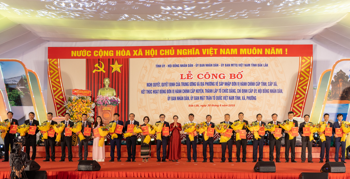 (ĐCSVN) - Sáng 30/6, tại Quảng trường 10/3 (tỉnh Đắk Lắk), Tỉnh ủy, HĐND, UBND, Ủy ban MTTQ Việt Nam tỉnh Đắk Lắk long trọng tổ chức Lễ công bố nghị quyết, quyết định của Trung ương và địa phương về hợp nhất, sáp nhập đơn vị hành chính các cấp.