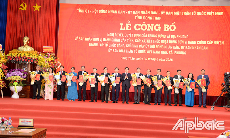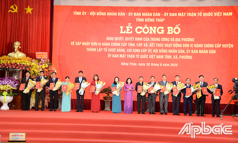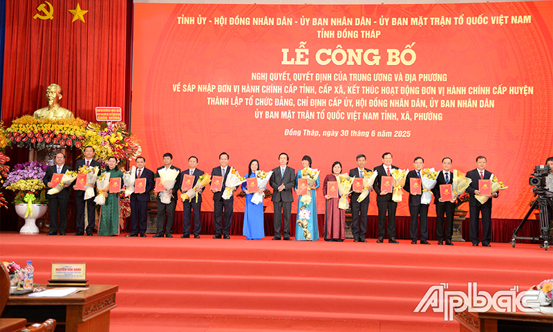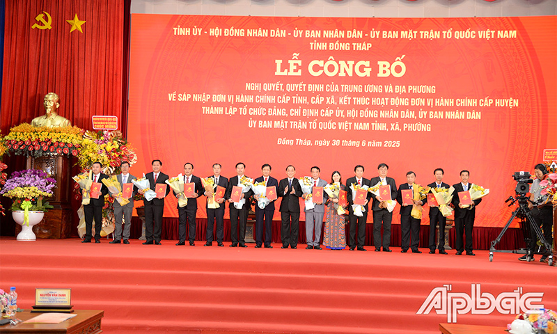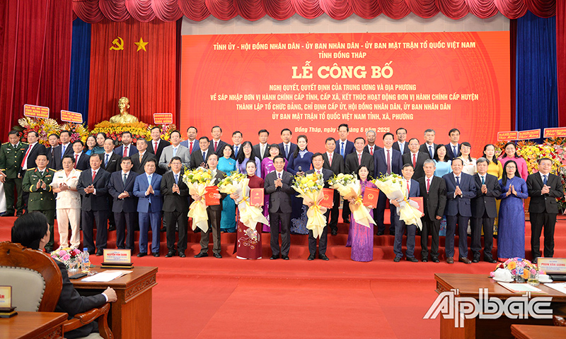 Sáng ngày 30/6, tại Hội trường Ấp Bắc, Trung tâm Hội nghị tỉnh, Tỉnh ủy - Hội đồng nhân dân - UBND - Ủy ban Mặt trận Tổ quốc Việt Nam tỉnh Đồng Tháp long trọng tổ chức Lễ công bố Nghị quyết, Quyết định của Trung ương và địa phương về sáp nhập đơn vị hành chính cấp tỉnh, cấp xã, kết thúc hoạt động đơn vị hành chính cấp huyện, thành lập tổ chức Đảng, chỉ định cấp ủy, Hội đồng nhân dân, UBND, Ủy ban Mặt trận Tổ quốc Việt Nam tỉnh, xã, phường.