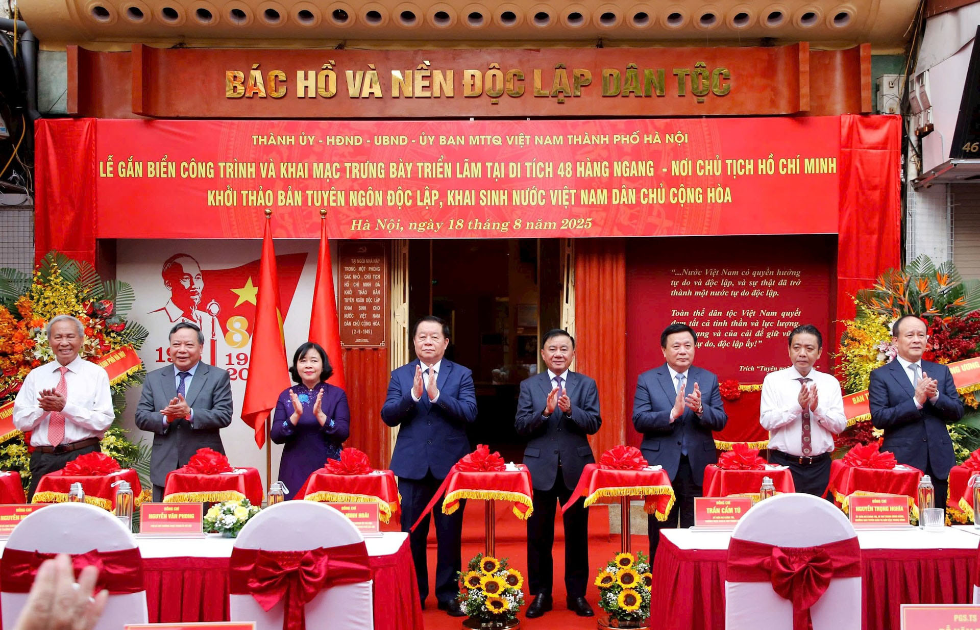 (ĐCSVN) - Sáng 18/8, Thành ủy, HĐND - UBND, Ủy ban MTTQ Việt Nam thành phố Hà Nội tổ chức Lễ gắn biển công trình và trưng bày triển lãm tại di tích lịch sử 48 Hàng Ngang, phường Hoàn Kiếm. Đây là hoạt động trọng tâm nằm trong chuỗi các sự kiện của thành phố Hà Nội chào mừng kỷ niệm 80 năm Cách mạng Tháng Tám thành công (19/8/1945-19/8/2025) và Quốc khánh nước Cộng hòa xã hội chủ nghĩa Việt Nam (2/9/1945-2/9/2025).