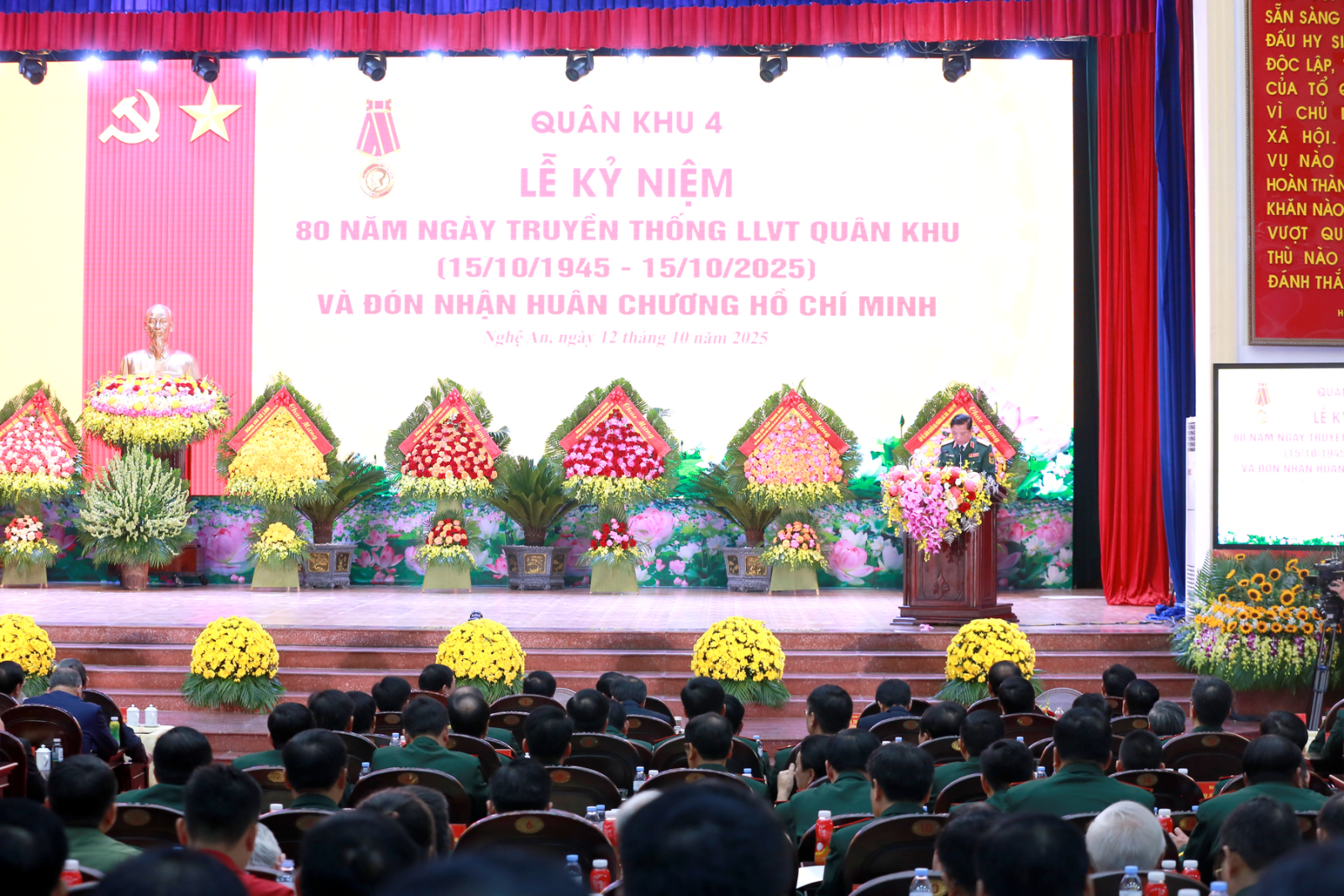 Diễn văn Kỷ niệm do đồng chí Trung tướng Hà Thọ Bình, Phó Bí thư Đảng ủy, Tư lệnh Quân khu trình bày cho biết, cách đây đúng 80 năm, ngày 15/10/1945, Chủ tịch Hồ Chí Minh kính yêu đã ký Sắc lệnh thành lập 12 chiến khu trong cả nước, trong đó có Chiến khu 4 - tiền thân của LLVT Quân khu 4 ngày nay. Từ mốc son lịch sử ấy, ngày 15/10 hằng năm trở thành Ngày truyền thống vẻ vang của LLVT Quân khu. Trong suốt tiến trình cách mạng, Quân khu đã có những tên gọi gắn liền với từng giai đoạn lịch sử: Chiến khu 4, Liên khu 4 và Quân khu 4.