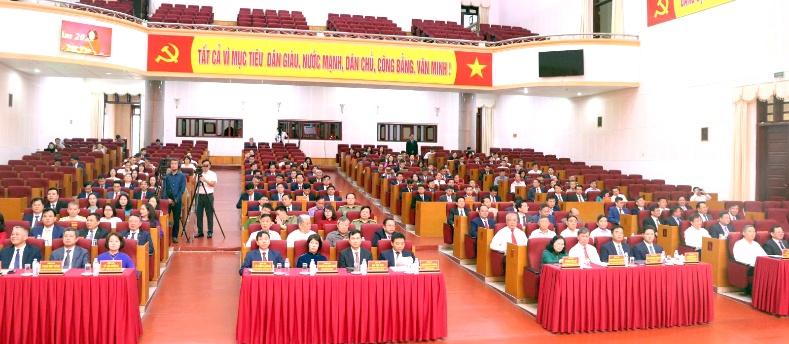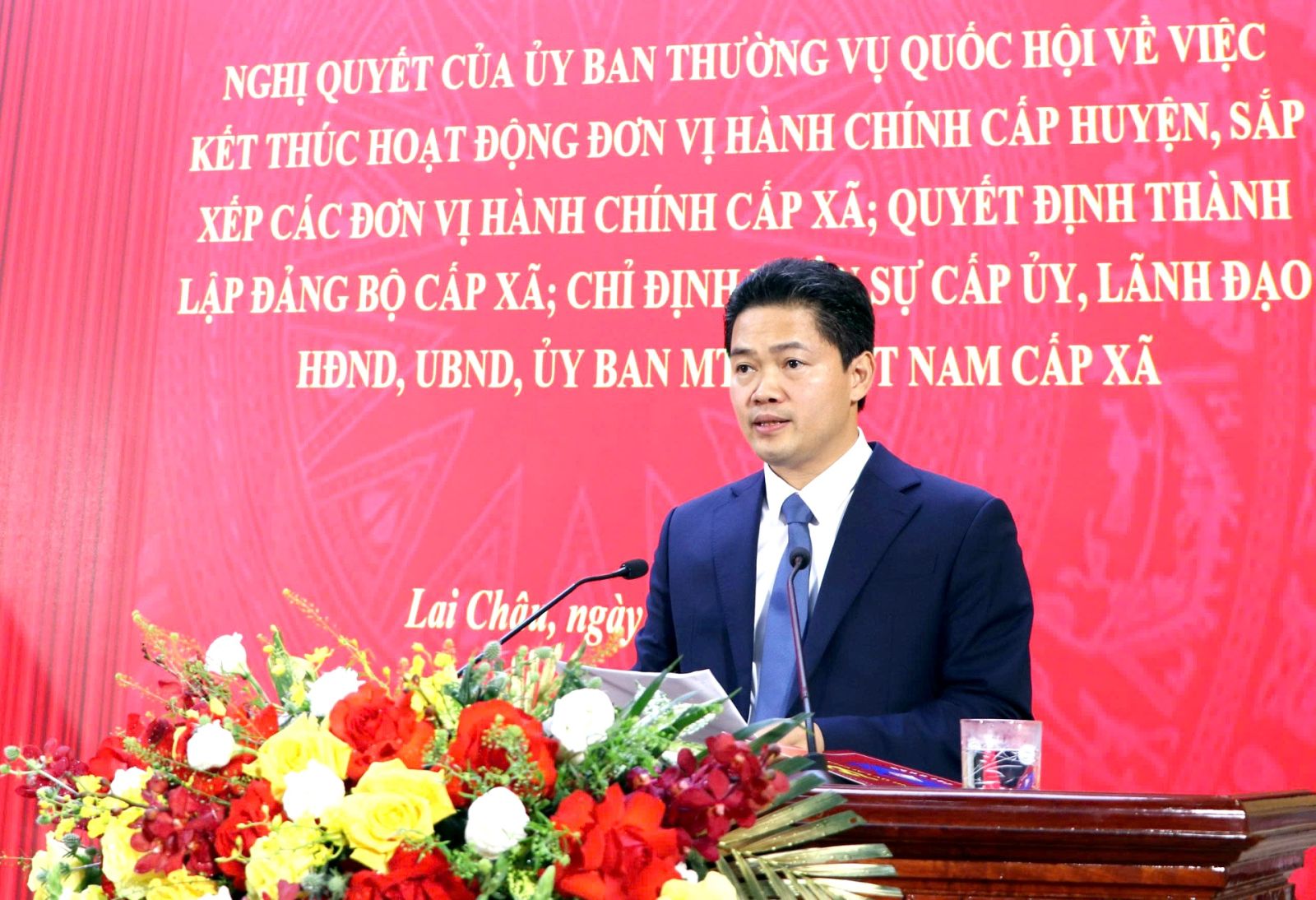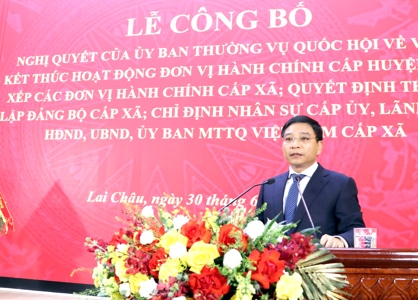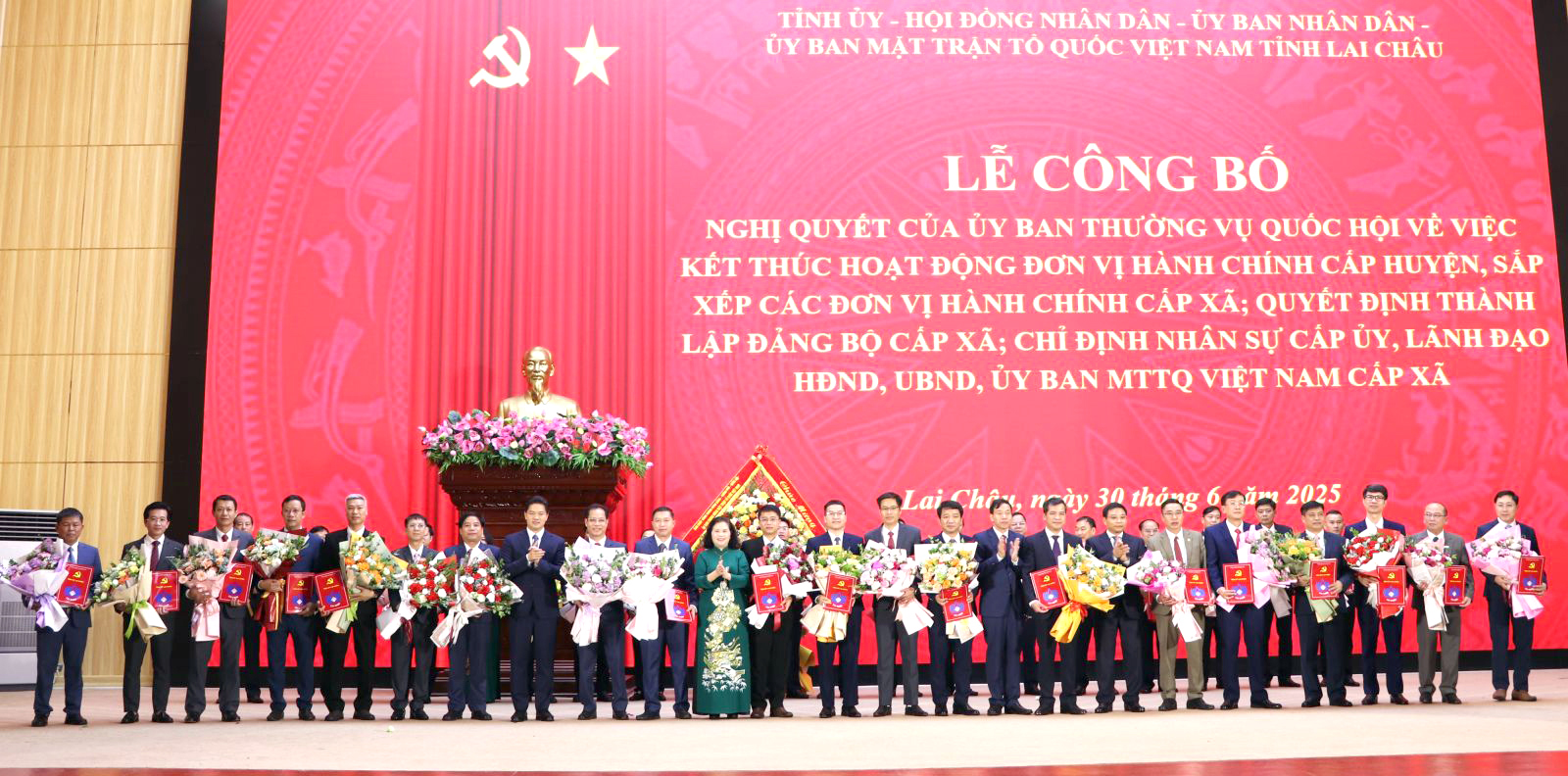 Sáng 30/6, Tỉnh ủy, HĐND, UBND, Ủy ban MTTQ Việt Nam tỉnh Lai Châu long trọng tổ chức Lễ công bố Nghị quyết của Ủy ban Thường vụ Quốc hội về việc kết thúc hoạt động đơn vị hành chính cấp huyện, sắp xếp các đơn vị hành chính cấp xã; Quyết định thành lập Đảng bộ cấp xã; chỉ định nhân sự cấp ủy, lãnh đạo HĐND, UBND, Ủy ban MTTQ Việt Nam cấp xã. Buổi Lễ được tổ chức trực tiếp tại điểm cầu tỉnh và truyền hình trực tiếp đến điểm cầu các xã mới sau sắp xếp, hợp nhất.