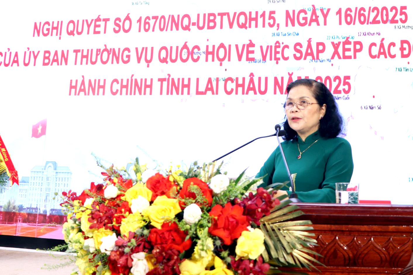Tại buổi Lễ, đồng chí Giàng Páo Mỷ - Bí thư Tỉnh ủy đã công bố Nghị quyết số 1670/NQ-UBTVQH15 ngày 16/6/2025 của Ủy ban Thường vụ Quốc hội về sắp xếp các đơn vị hành chính cấp xã của tỉnh Lai Châu năm 2025. Theo đó, sắp xếp toàn bộ diện tích tự nhiên, quy mô dân số của 106 xã, phường, thị trấn trước đây thành 38 xã, phường mới.
