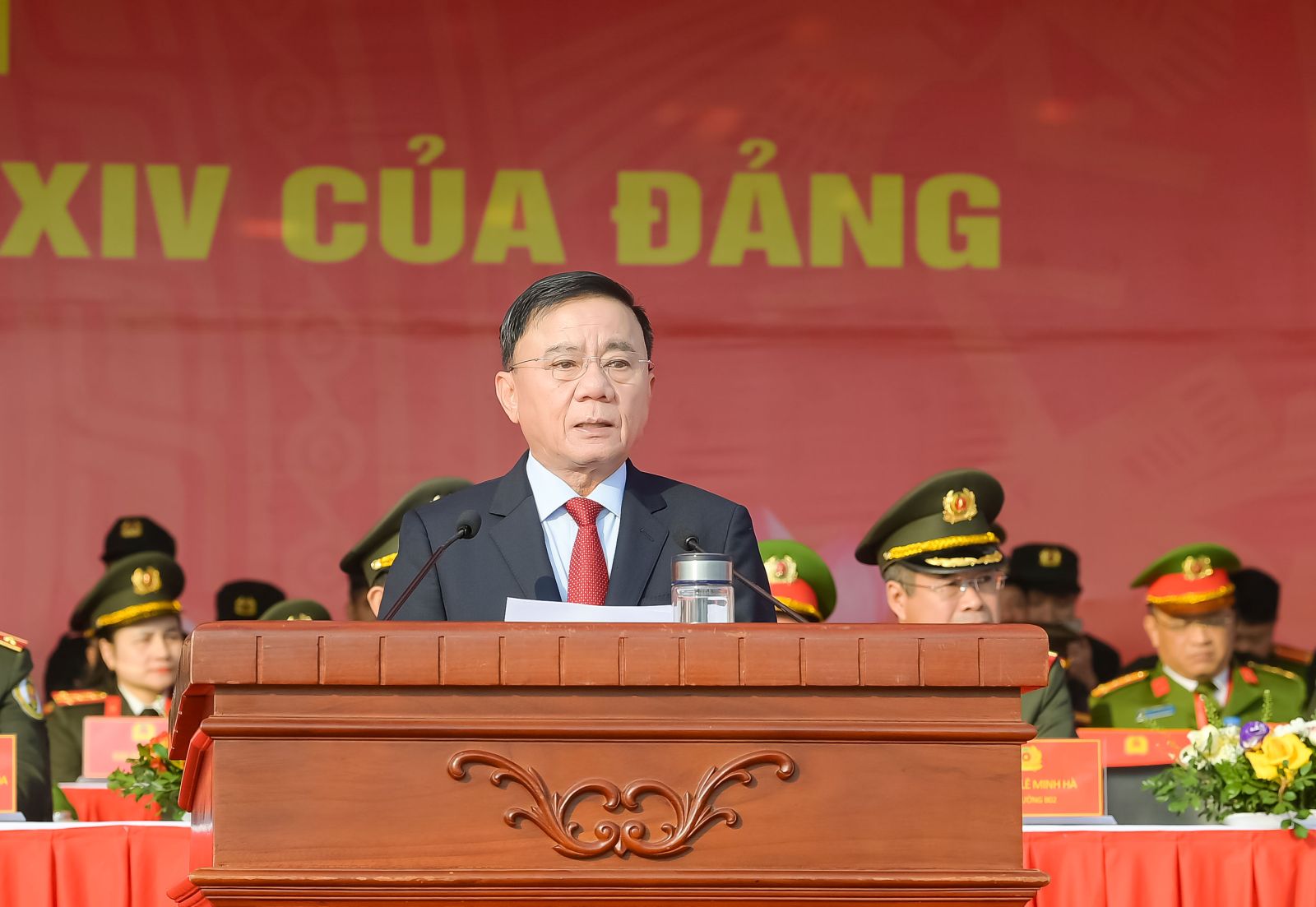 Đồng chí Thường trực Ban Bí thư Trần Cẩm Tú phát biểu chỉ đạo tại Lễ xuất quân và diễn tập phương án bảo đảm an ninh, trật tự Đại hội đại biểu toàn quốc lần thứ XIV của Đảng.