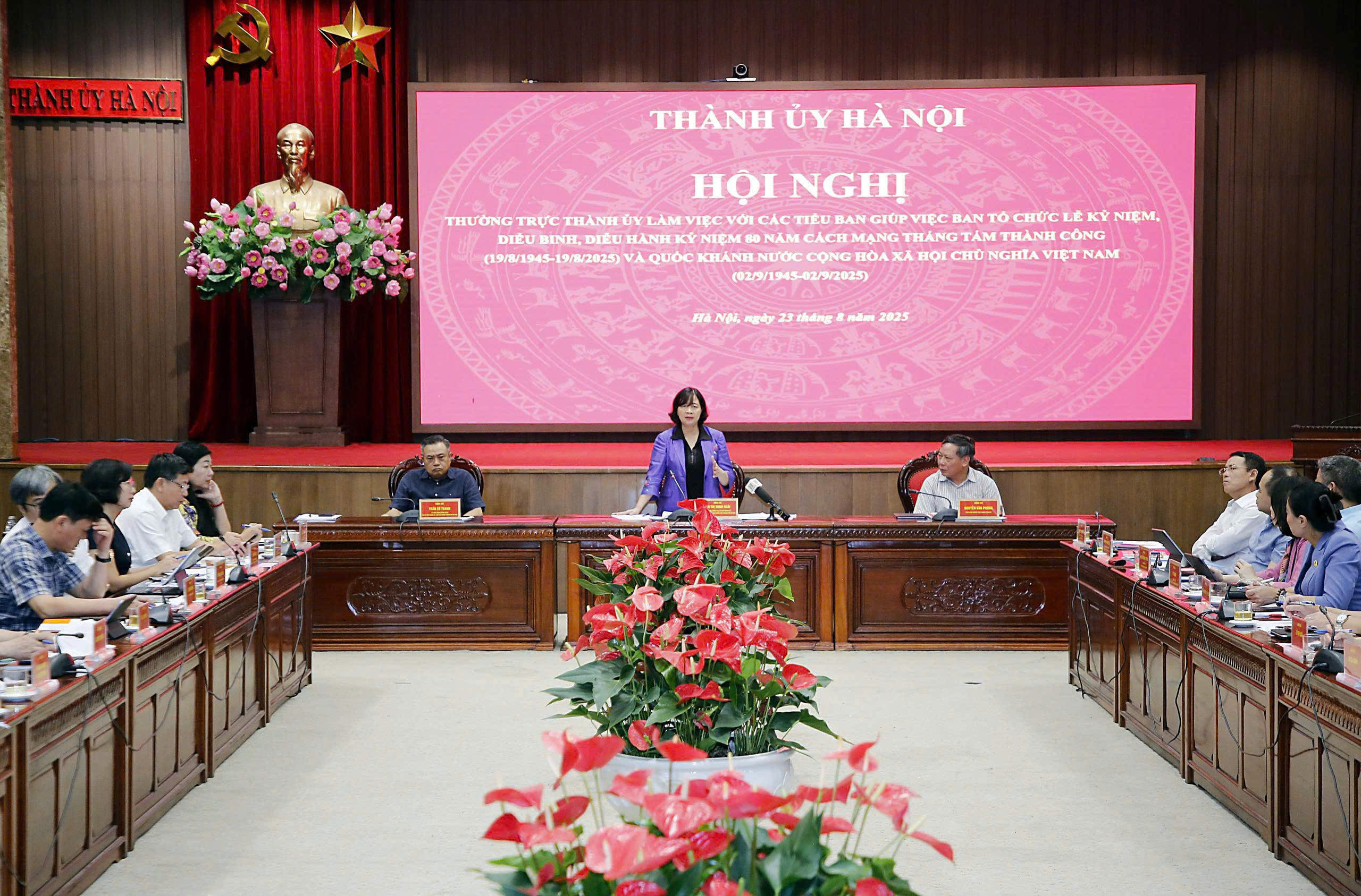 (ĐCSVN) - Đó là nhấn mạnh của đồng chí Bùi Thị Minh Hoài, Ủy viên Bộ Chính trị, Bí thư Thành ủy, Trưởng đoàn đại biểu Quốc hội thành phố Hà Nội tại buổi làm việc giữa Thường trực Thành ủy Hà Nội với các tiểu ban giúp việc Ban Tổ chức Lễ kỷ niệm, diễu binh, diễu hành kỷ niệm 80 năm Cách mạng Tháng Tám thành công (19/8/1945-19/8/2025) và Quốc khánh nước Cộng hòa xã hội chủ nghĩa Việt Nam (2/9/1945-2/9/2025) vào ngày 23/8.