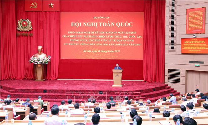 Sáng 18/9, Ủy viên Bộ Chính trị, Thủ tướng Chính phủ Phạm Minh Chính dự Hội nghị toàn quốc triển khai Nghị quyết số 147/NQ-CP ngày 22/5/2025 của Chính phủ về Chiến lược tổng thể quốc gia phòng ngừa, ứng phó với các đe dọa an ninh phi truyền thống đến năm 2030, tầm nhìn đến năm 2045 (Nghị quyết 147).