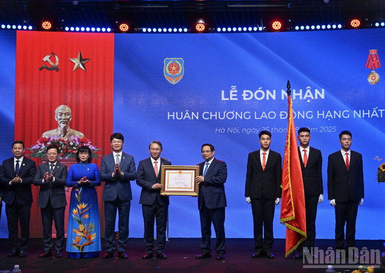 Thay mặt Lãnh đạo Đảng, Nhà nước, Thủ tướng Phạm Minh Chính trao Huân chương Lao động hạng Nhất tặng Bộ Tư pháp. (Ảnh: TRẦN HẢI)
