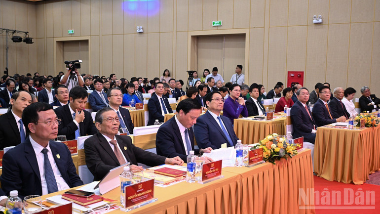 Thủ tướng Phạm Minh Chính, các đồng chí lãnh đạo, nguyên lãnh đạo, các đại biểu tham dự buổi lễ. (Ảnh: TRẦN HẢI)