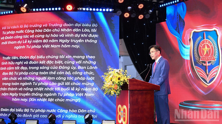 Bộ trưởng Tư pháp Lào Phayvy Siboualypha phát biểu ý kiến tại buổi lễ. (Ảnh: TRẦN HẢI)