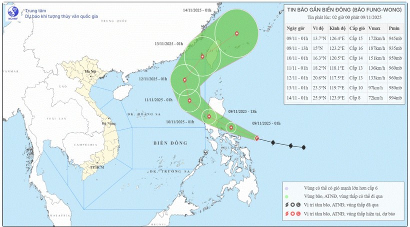 Theo Trung tâm Dự báo khí tượng Thủy văn Quốc gia, bão Fung-wong di chuyển nhanh và có cường độ rất mạnh (cấp 15, giật trên cấp 17).