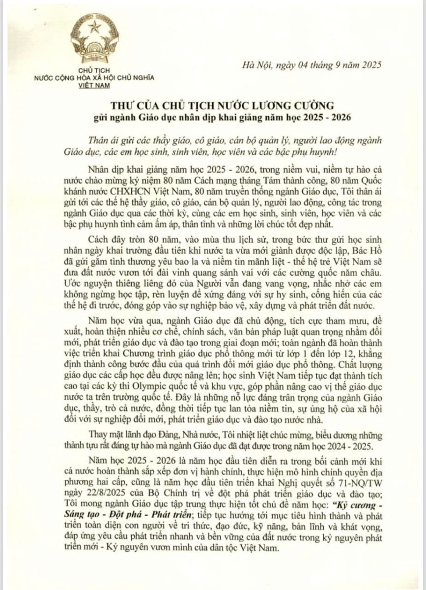Thư của Chủ tịch nước Lương Cường gửi ngành Giáo dục nhân dịp khai giảng năm học 2025-2026