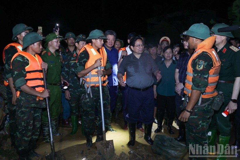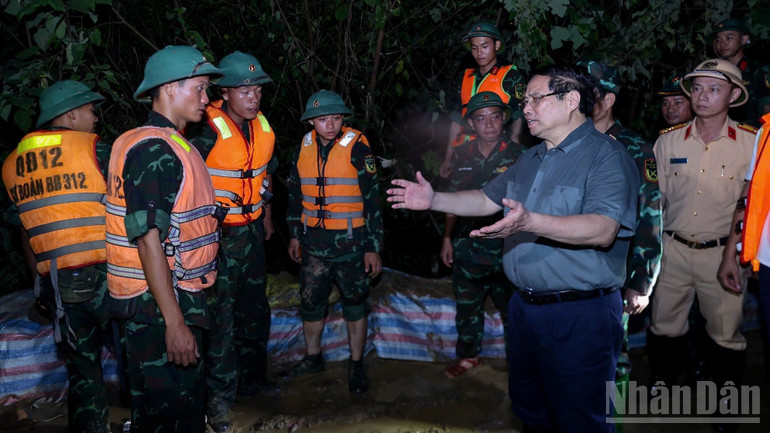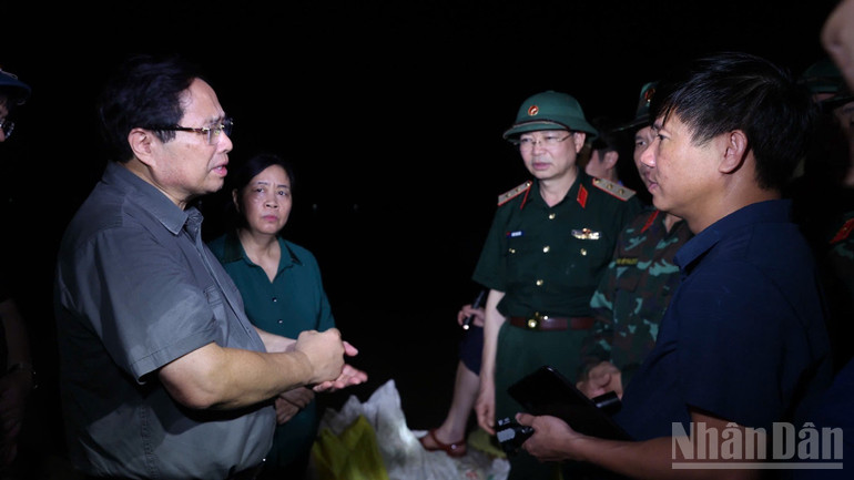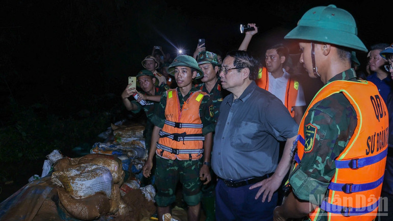 Đến động viên các lực lượng đang làm nhiệm vụ hộ đê, Thủ tướng cảm ơn các cán bộ, chiến sĩ đã làm xuyên đêm với tinh thần trách nhiệm cao nhất, khẩn trương nhất; đề nghị các lực lượng phân công nhiệm vụ hợp lý, có cách làm khoa học, hiệu quả nhất, kịp thời phát hiện, ứng phó, khắc phục kịp thời các sự cố dù nhỏ nhất ngay khi mới xảy ra.