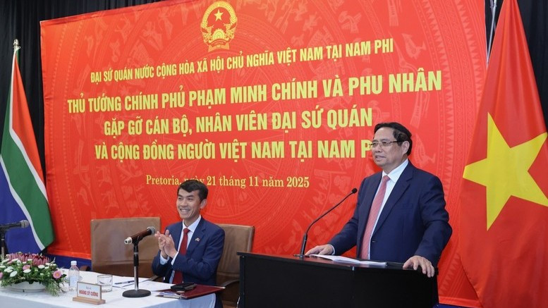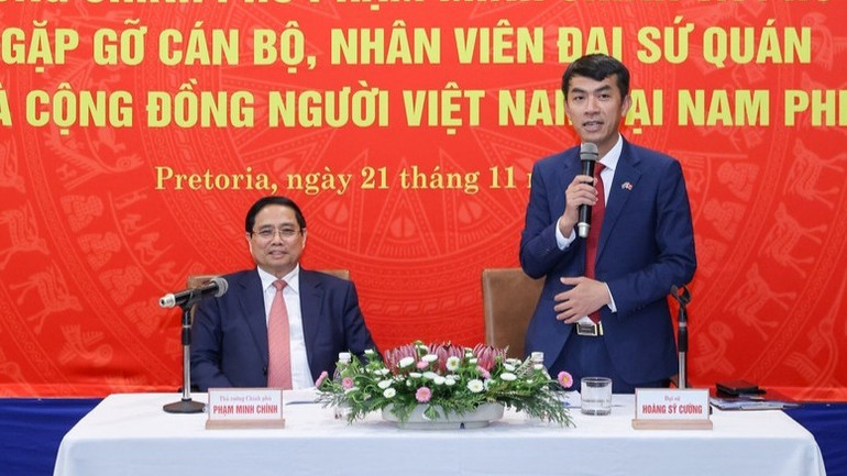 Chiều 21/11, theo giờ địa phương, trong chương trình tham dự Hội nghị Thượng đỉnh G20 và hoạt động song phương tại Nam Phi, tại thành phố Pretoria, Thủ tướng Phạm Minh Chính cùng Phu nhân Lê Thị Bích Trân và Đoàn đại biểu cấp cao Việt Nam đã gặp gỡ cán bộ, nhân viên Đại sứ quán và cộng đồng người Việt Nam tại Nam Phi.