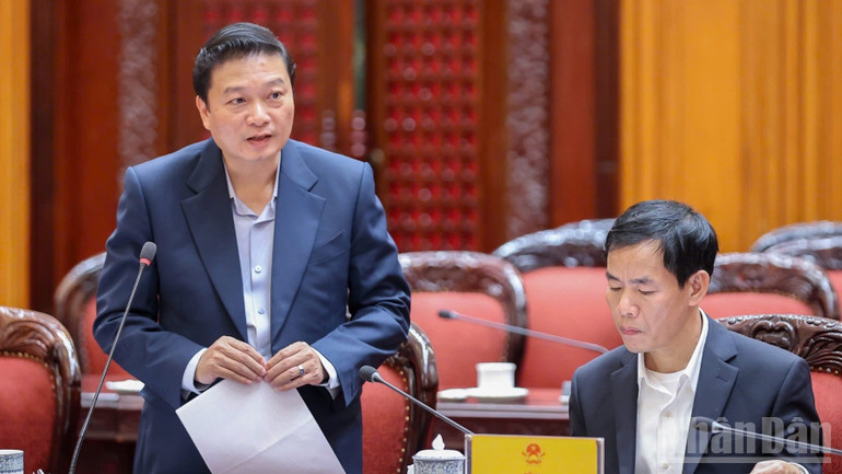 Lãnh đạo tỉnh Quảng Trị báo cáo Thủ tướng Chính phủ tại cuộc họp. (Ảnh: Trần Hải)
