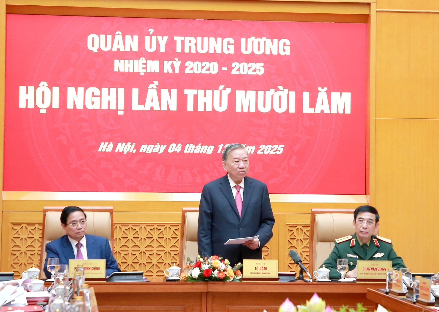 (ĐCSVN) - Sáng 4/12, Quân ủy Trung ương tổ chức Hội nghị lần thứ mười lăm nhằm đánh giá kết quả lãnh đạo thực hiện nhiệm vụ công tác quân sự, quốc phòng năm 2025, phương hướng nhiệm vụ năm 2026; cho ý kiến vào dự thảo Nghị quyết lãnh đạo nhiệm vụ quân sự, quốc phòng và xây dựng Đảng bộ Quân đội năm 2026, đồng thời, xem xét, cho ý kiến, quyết định một số nội dung quan trọng khác. Tổng Bí thư Tô Lâm, Bí thư Quân ủy Trung ương chủ trì hội nghị.