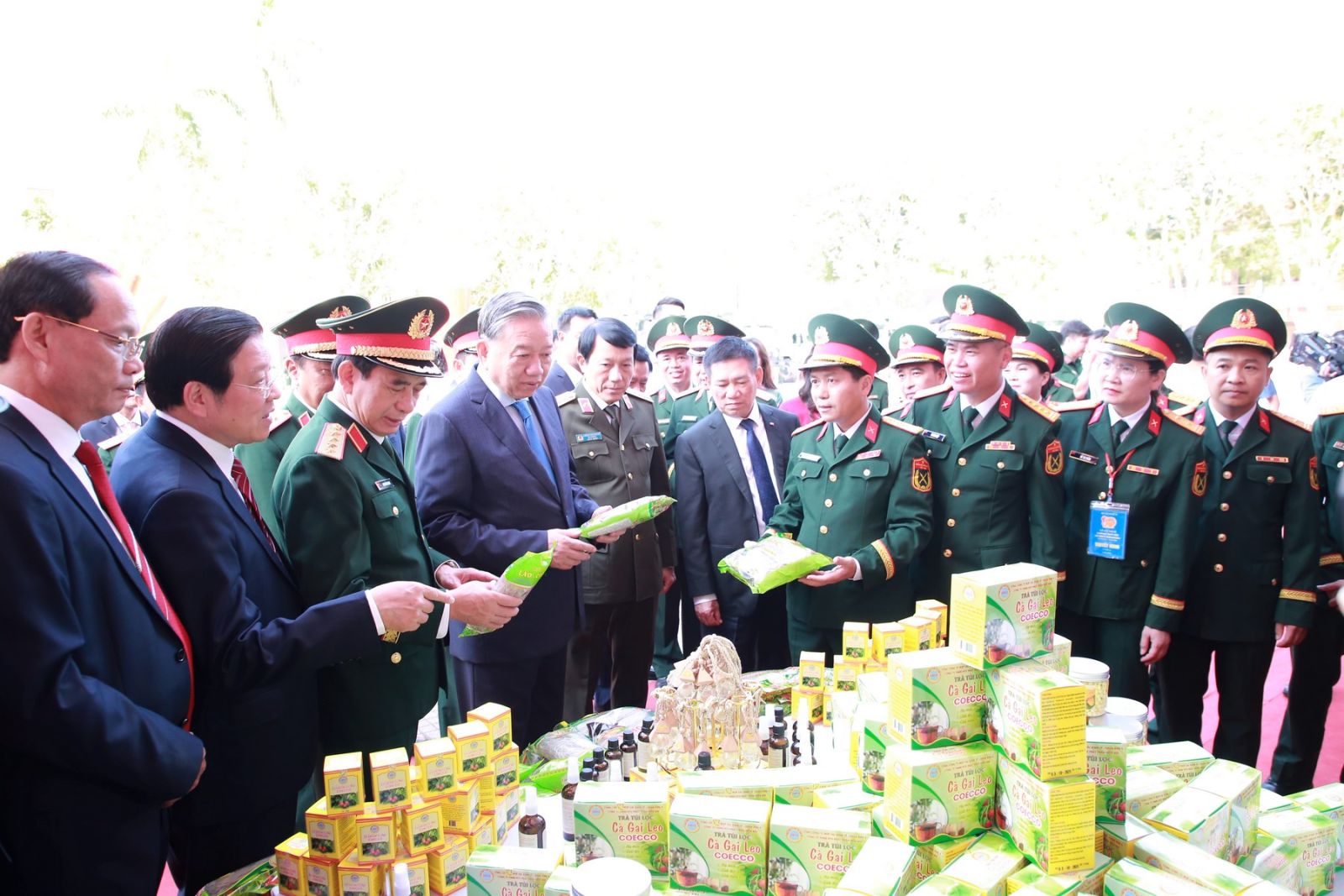 Tổng Bí thư Tô Lâm và các đồng chí Lãnh đạo Đảng, Nhà nước, Bộ Quốc phòng tham quan triển lãm tại sự kiện.