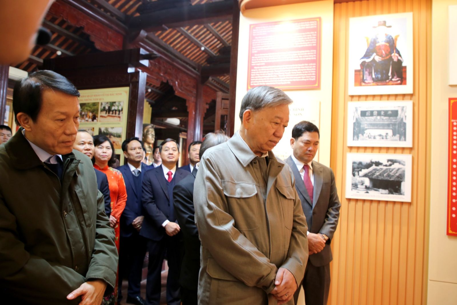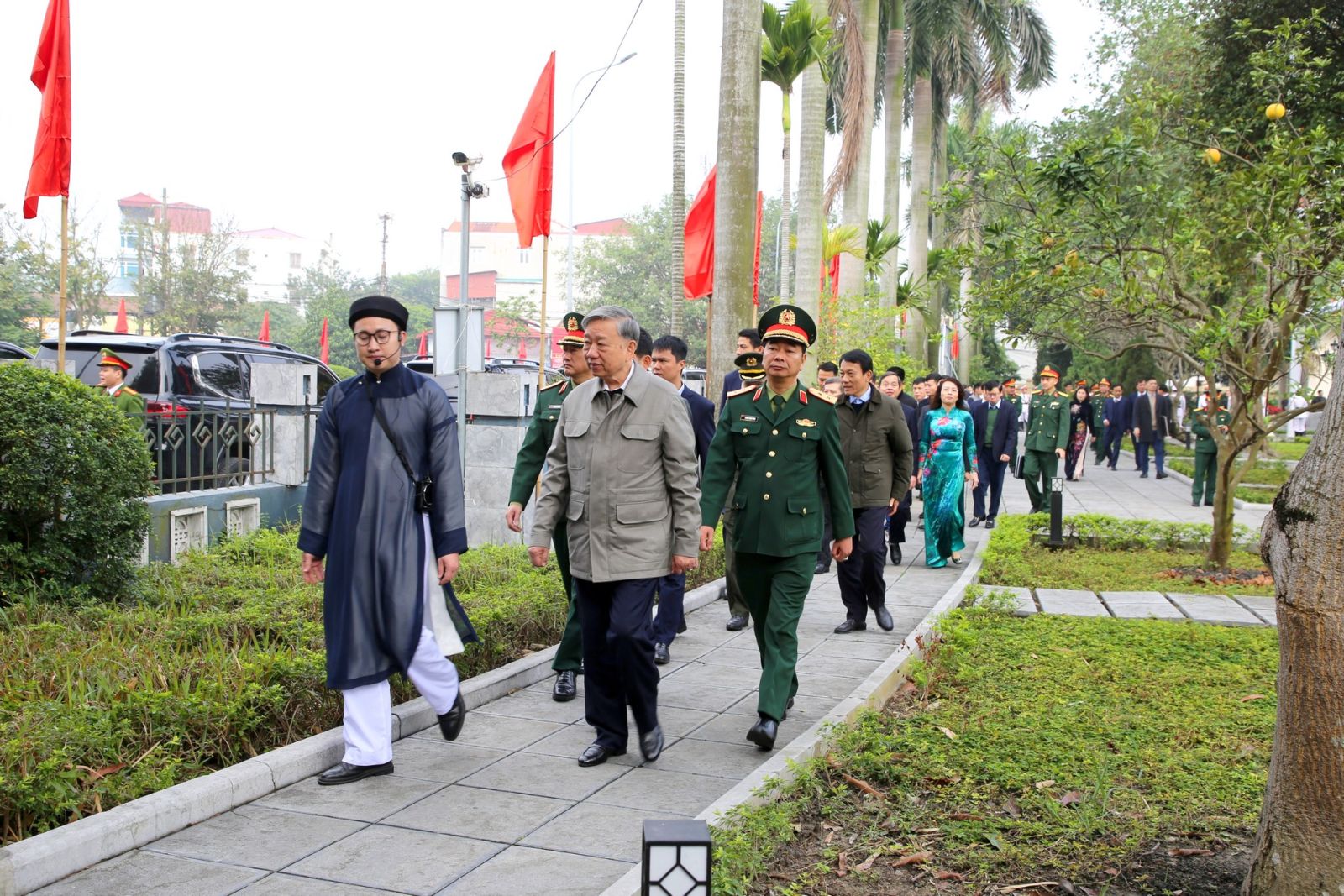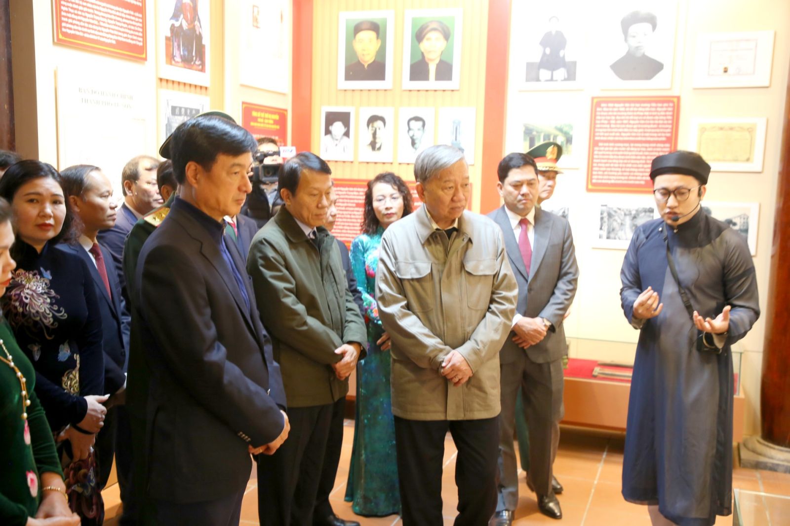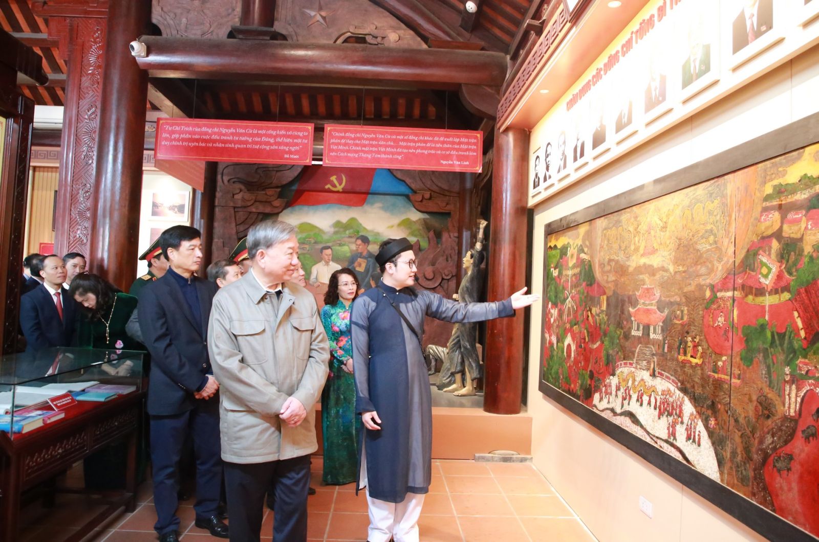 Ngay sau lễ dâng hương, Tổng Bí thư Tô Lâm cùng đoàn đại biểu đi thăm quan Nhà lưu niệm gốc, khu trưng bày tư liệu, hiện vật, nhà lưu niệm - nơi gắn bó những năm tháng tuổi thơ của Tổng Bí thư Nguyễn Văn Cừ.