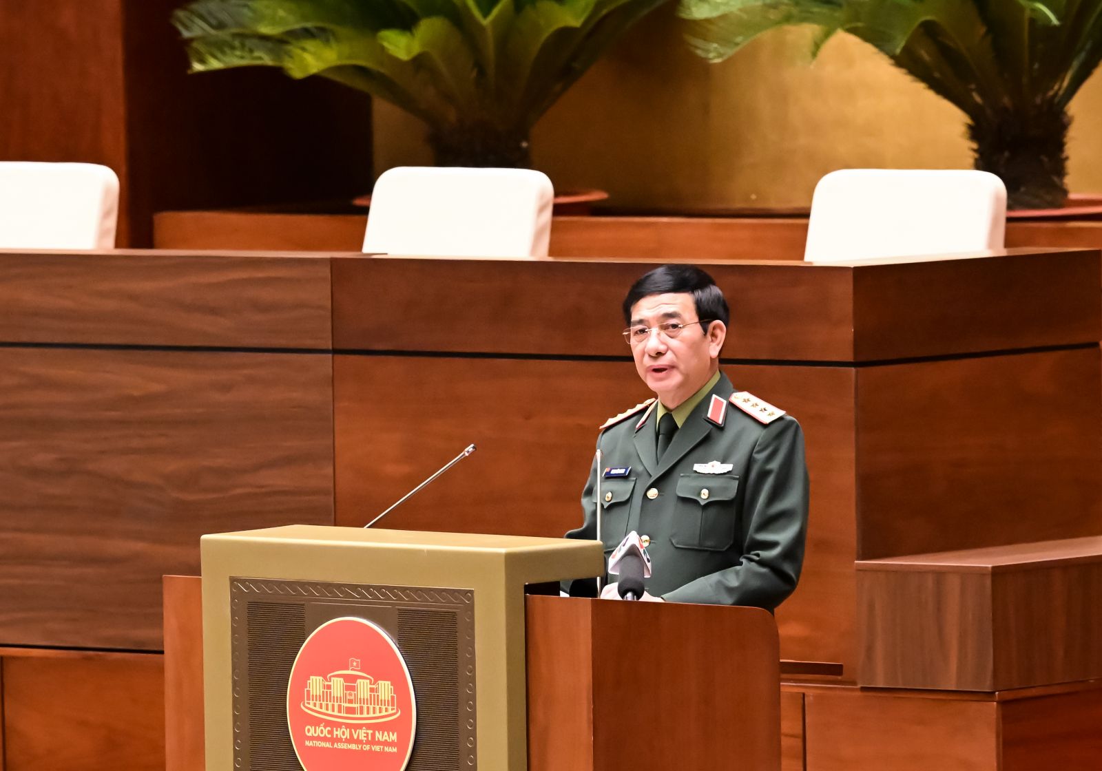 Đồng chí Phan Văn Giang, Ủy viên Bộ Chính trị, Bộ trưởng Bộ Quốc phòng truyền đạt chuyên đề “Tư duy, nhận thức mới về quốc phòng, bảo vệ Tổ quốc của Đại hội XIV”.
