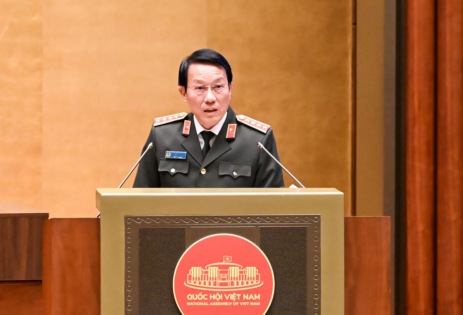 Đồng chí Lương Tam Quang, Ủy viên Bộ Chính trị, Bộ trưởng Bộ Công an truyền đạt chuyên đề “Tư duy, nhận thức mới về an ninh quốc gia của Đại hội XIV”.