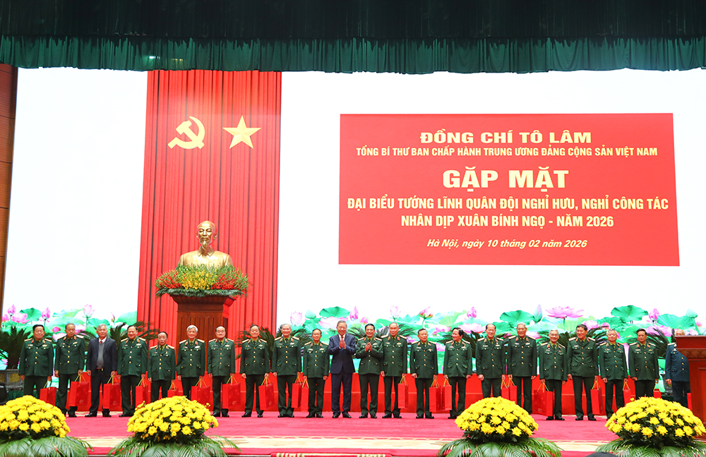 (ĐCSVN) - Chiều 10/2, tại Trụ sở Bộ Quốc phòng, đồng chí Tổng Bí thư Tô Lâm, Bí thư Quân ủy Trung ương đã dự, chủ trì gặp mặt đại biểu tướng lĩnh Quân đội nghỉ hưu, nghỉ công tác nhân dịp đón Xuân Bính Ngọ năm 2026.