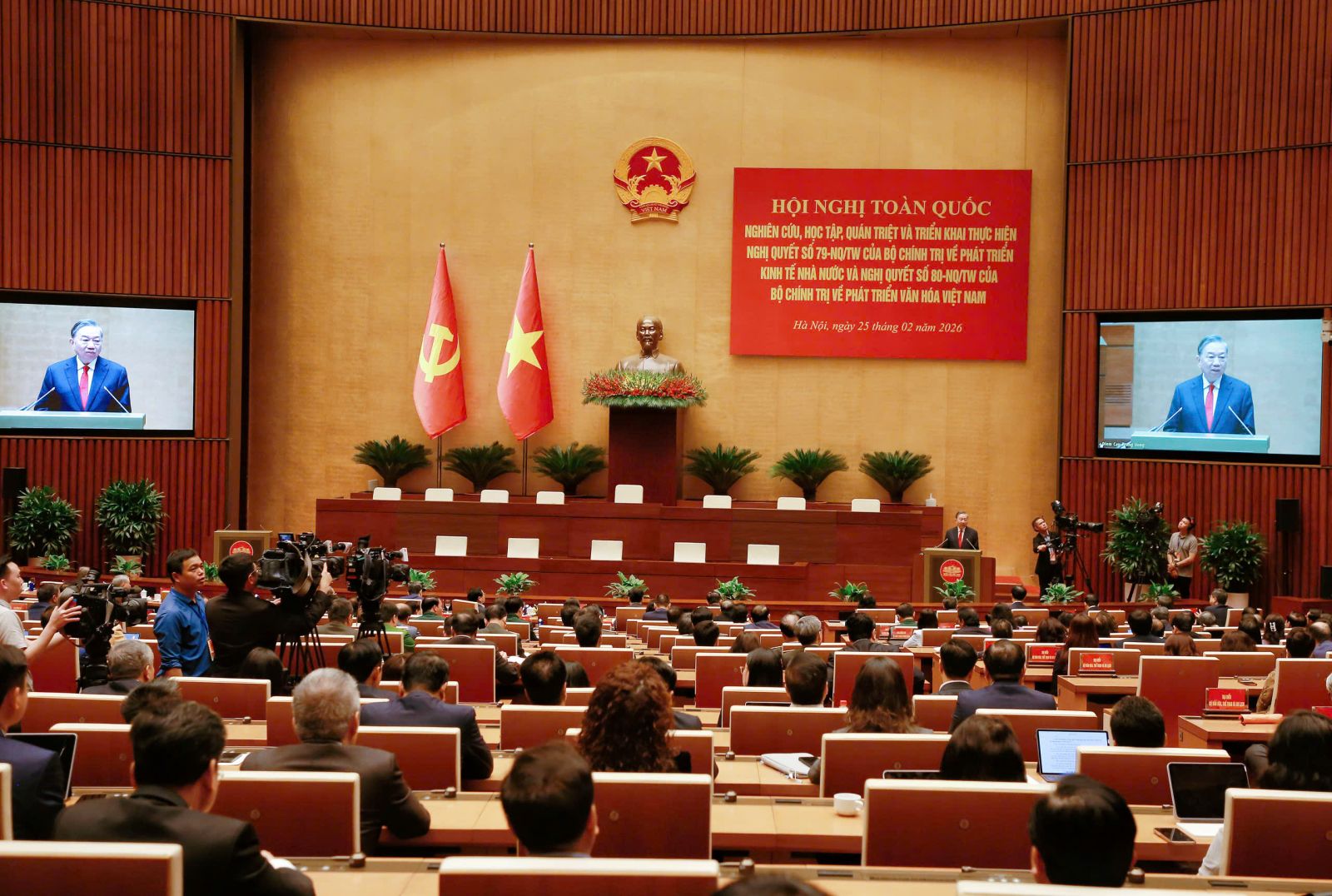 (ĐCSVN) - Phát biểu Kết luận Hội nghị toàn quốc nghiên cứu, học tập, quán triệt và triển khai thực hiện Nghị quyết số 79-NQ/TW của Bộ Chính trị về phát triển kinh tế nhà nước và Nghị quyết số 80-NQ/TW của Bộ Chính trị về phát triển văn hóa Việt Nam, sáng 25/2, Tổng Bí thư nêu rõ, bên cạnh những Nghị quyết đã ban hành trước đó, hai Nghị quyết mới là sự bổ sung thêm những quyết sách lớn của Đảng, được hình thành trên cơ sở tổng kết sâu sắc thực tiễn và phát triển tư duy lý luận trong bối cảnh đất nước bước vào giai đoạn phát triển mới, nhằm đồng thời giải quyết hai yêu cầu có tính nền tảng là tăng cường “nội lực vật chất” và củng cố “nội lực tinh thần”. Khẳng định quyết tâm xây dựng nền kinh tế độc lập, tự chủ, năng động, hiệu quả gắn với hội nhập quốc tế sâu rộng và xây dựng nền văn hóa Việt Nam tiên tiến, đậm đà bản sắc dân tộc.