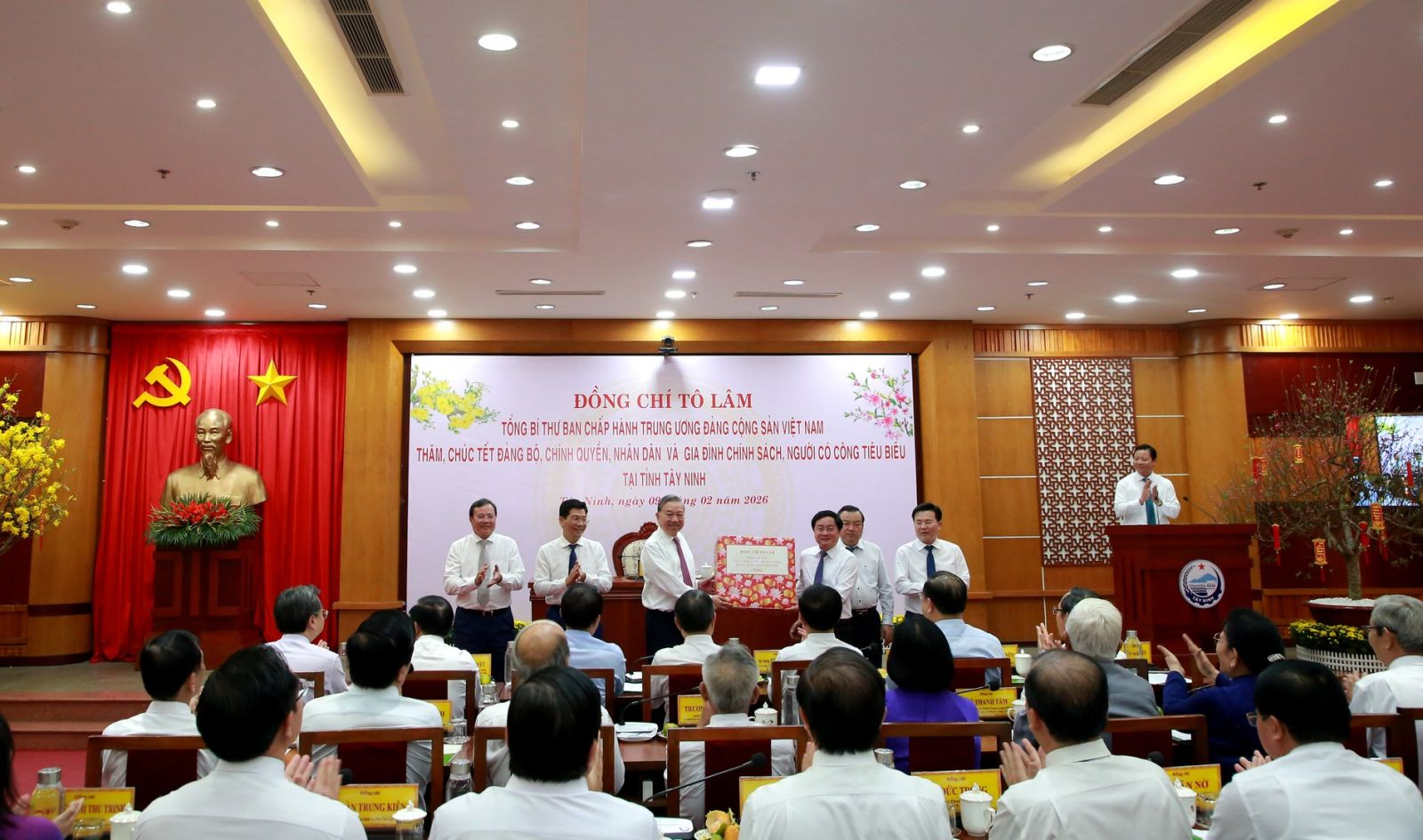 Phát biểu tại cuộc thăm và chúc Tết, Tổng Bí thư Tô Lâm nêu rõ, Tây Ninh là vùng đất giàu truyền thống cách mạng, gắn liền với Trung ương Cục miền Nam - một biểu tượng sáng ngời của ý chí kiên cường, tinh thần tự lực, tự cường trong sự nghiệp đấu tranh giải phóng dân tộc, thống nhất đất nước. Tây Ninh đồng thời là tỉnh biên giới có vị trí chiến lược đặc biệt quan trọng, là cửa ngõ kết nối vùng Đông Nam Bộ năng động với vùng Tây Nam Bộ trù phú, kết nối Việt Nam với Campuchia và khu vực ASEAN.
