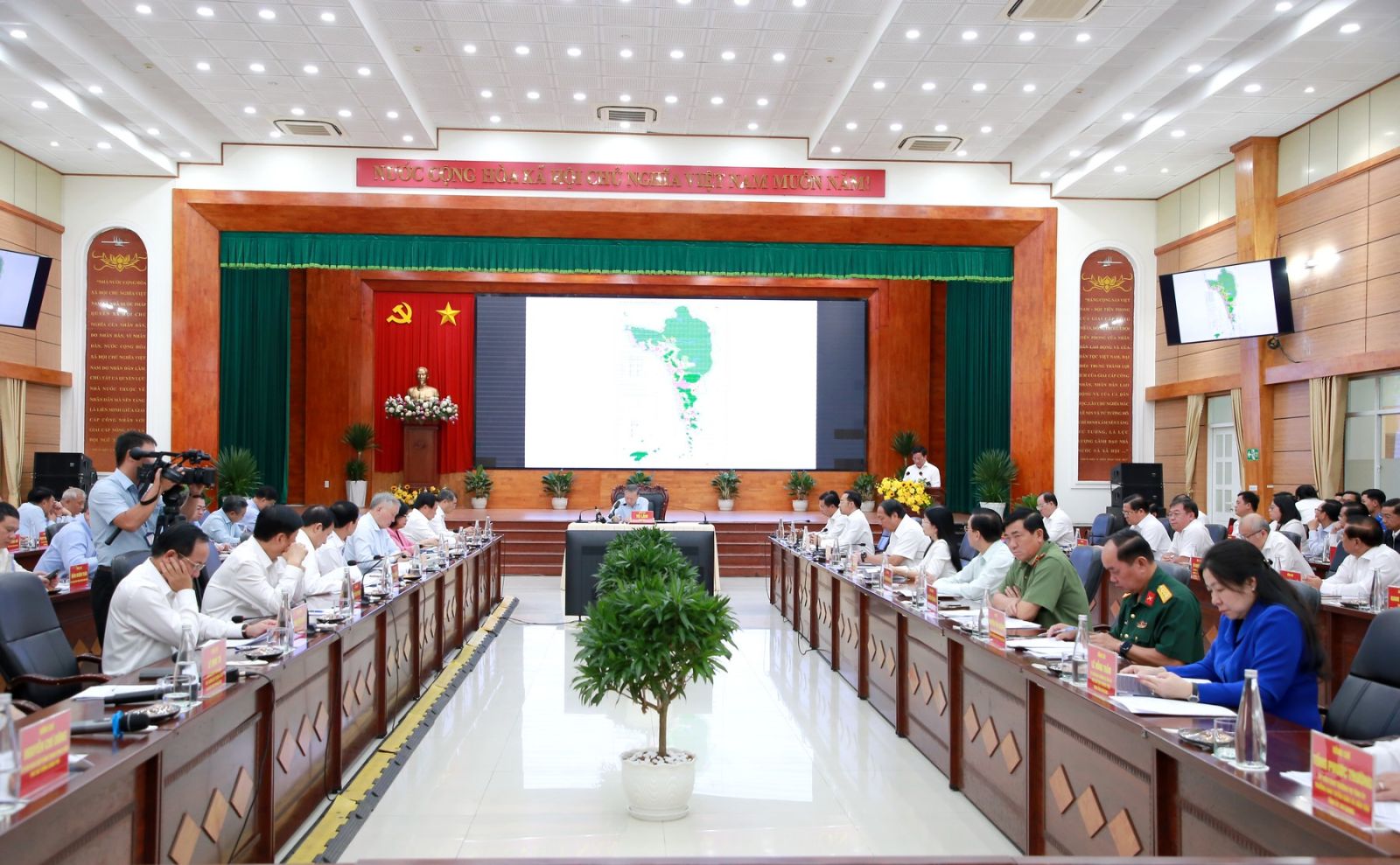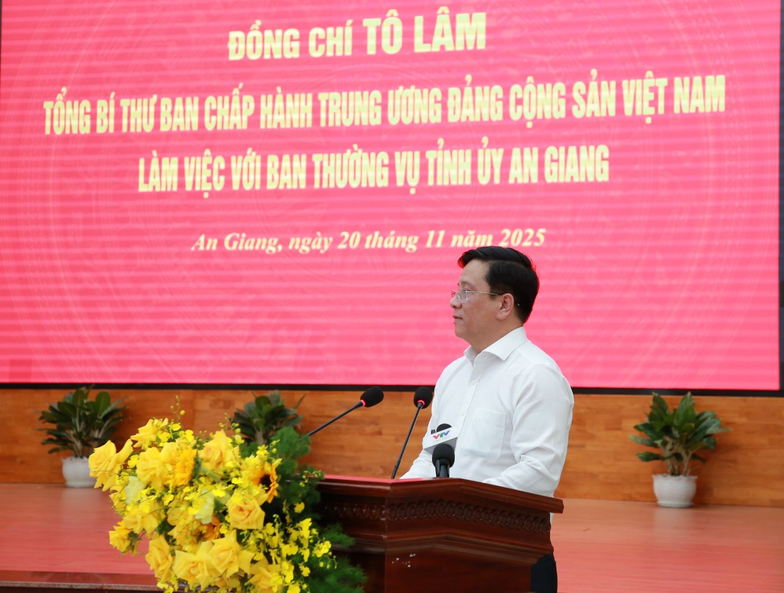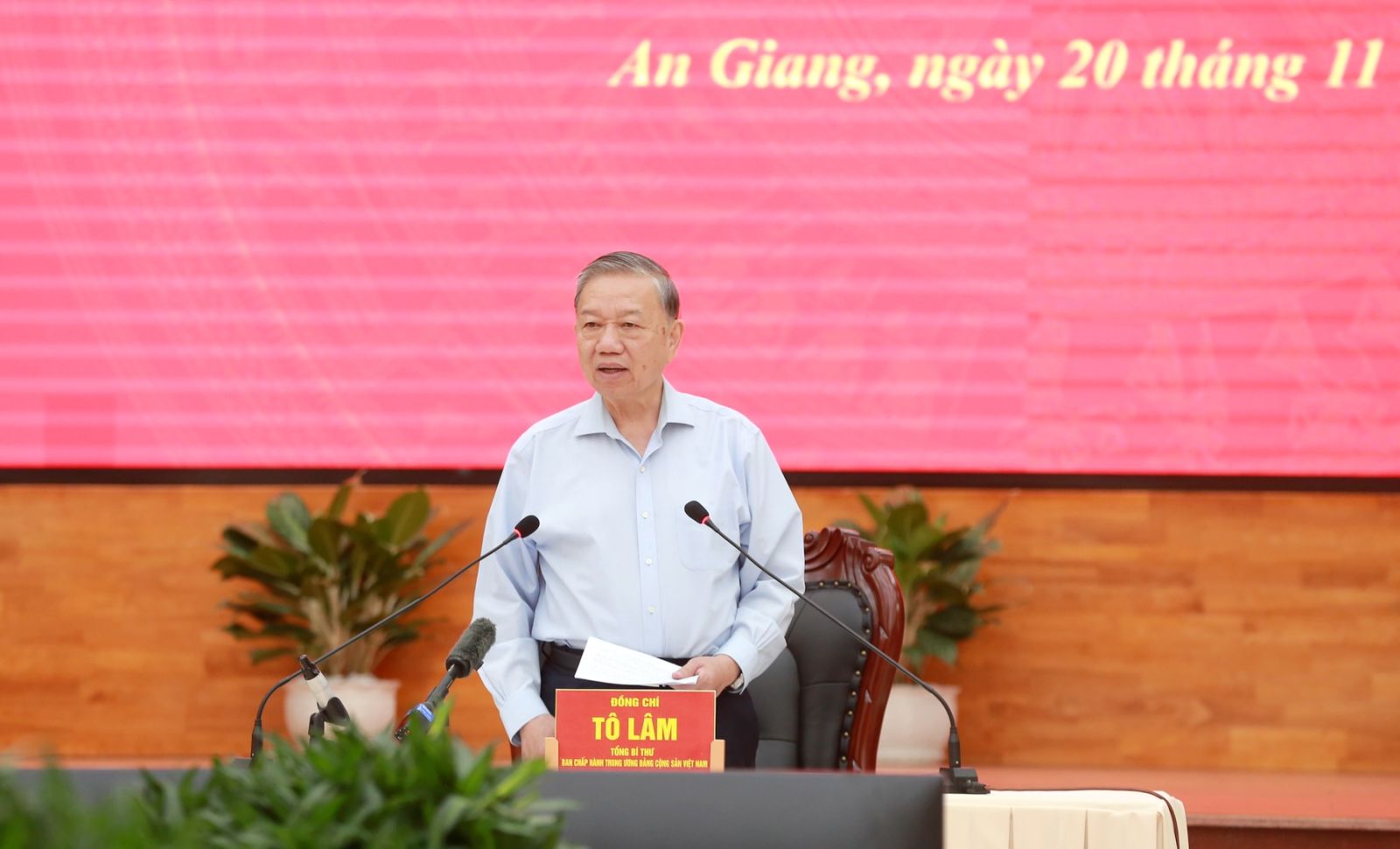 Phát biểu tại cuộc làm việc, Tổng Bí thư Tô Lâm bày tỏ vui mừng cùng Đoàn công tác Trung ương trở lại thăm và làm việc với tỉnh An Giang sau hợp nhất An Giang-Kiên Giang - vùng đất giàu truyền thống cách mạng, đậm nét văn hóa Nam Bộ, có vị trí địa chiến lược đặc biệt quan trọng, vừa là tỉnh đầu nguồn của sông Cửu Long, vừa là cánh cửa ngõ vươn ra Biển Tây Tổ quốc, có đặc khu Phú Quốc đang phát triển mạnh mẽ.
