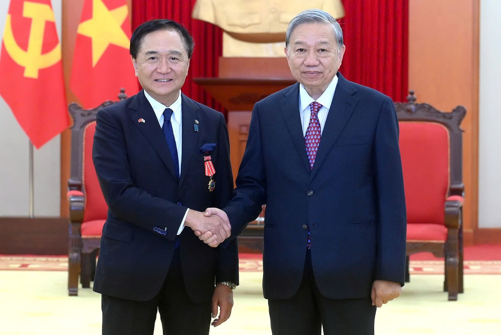 Tại buổi tiếp, Tổng Bí thư Tô Lâm bày tỏ vui mừng khi quan hệ Đối tác chiến lược toàn diện Việt Nam - Nhật Bản đang phát triển tốt đẹp trên mọi lĩnh vực với trụ cột chính là hợp tác kinh tế, trụ cột mới là hợp tác khoa học công nghệ, hợp tác văn hóa, kết nối nguồn nhân lực và giao lưu nhân dân ngày càng thiết thực và hiệu quả.