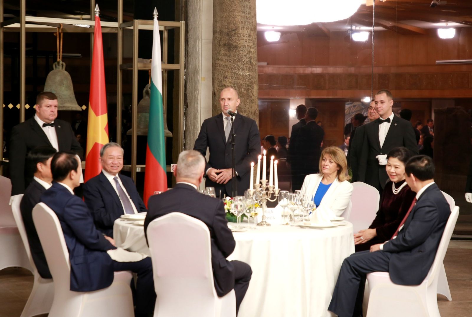 Tối cùng ngày, Tổng thống Cộng hòa Bulgaria Rumen Radev và Phu nhân đã chủ trì tiệc chiêu đãi chính thức Tổng Bí thư Tô Lâm và Phu nhân cùng Đoàn đại biểu cấp cao Việt Nam. Phát biểu tại đây, Tổng Bí thư Tô Lâm và Tổng thống Cộng hòa Bulgaria Rumen Radev đều khẳng định, sau 75 năm kể từ khi thiết lập quan hệ ngoại giao năm 1950 đến nay, Việt Nam và Bulgaria đã xây dựng và phát triển mối quan hệ hữu nghị truyền thống và hợp tác nhiều mặt tốt đẹp trên cơ sở tin cậy, bình đẳng, tôn trọng lẫn nhau, vì lợi ích của nhân dân hai nước. Hai nhà lãnh đạo bày tỏ vui mừng về kết quả tốt đẹp của chuyến thăm và làm việc lần này của Tổng Bí thư Việt Nam Tô Lâm tại Bulgaria và cho biết, hai bên đã nhất trí thông qua Tuyên bố chung về việc nâng cấp quan hệ Việt Nam - Bulgaria lên “Đối tác chiến lược”. Việc thiết lập khuôn khổ quan hệ Đối tác chiến lược Việt Nam - Bulgaria nhằm đưa quan hệ hai nước lên một tầm cao mới trên cả bình diện song phương và đa phương, tăng cường và củng cố các cơ chế hợp tác song phương hiện có, cũng như thúc đẩy hình thành các cơ chế mới nhằm làm sâu sắc hơn hợp tác giữa hai nước.