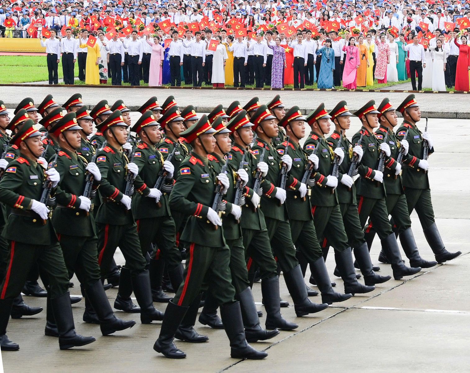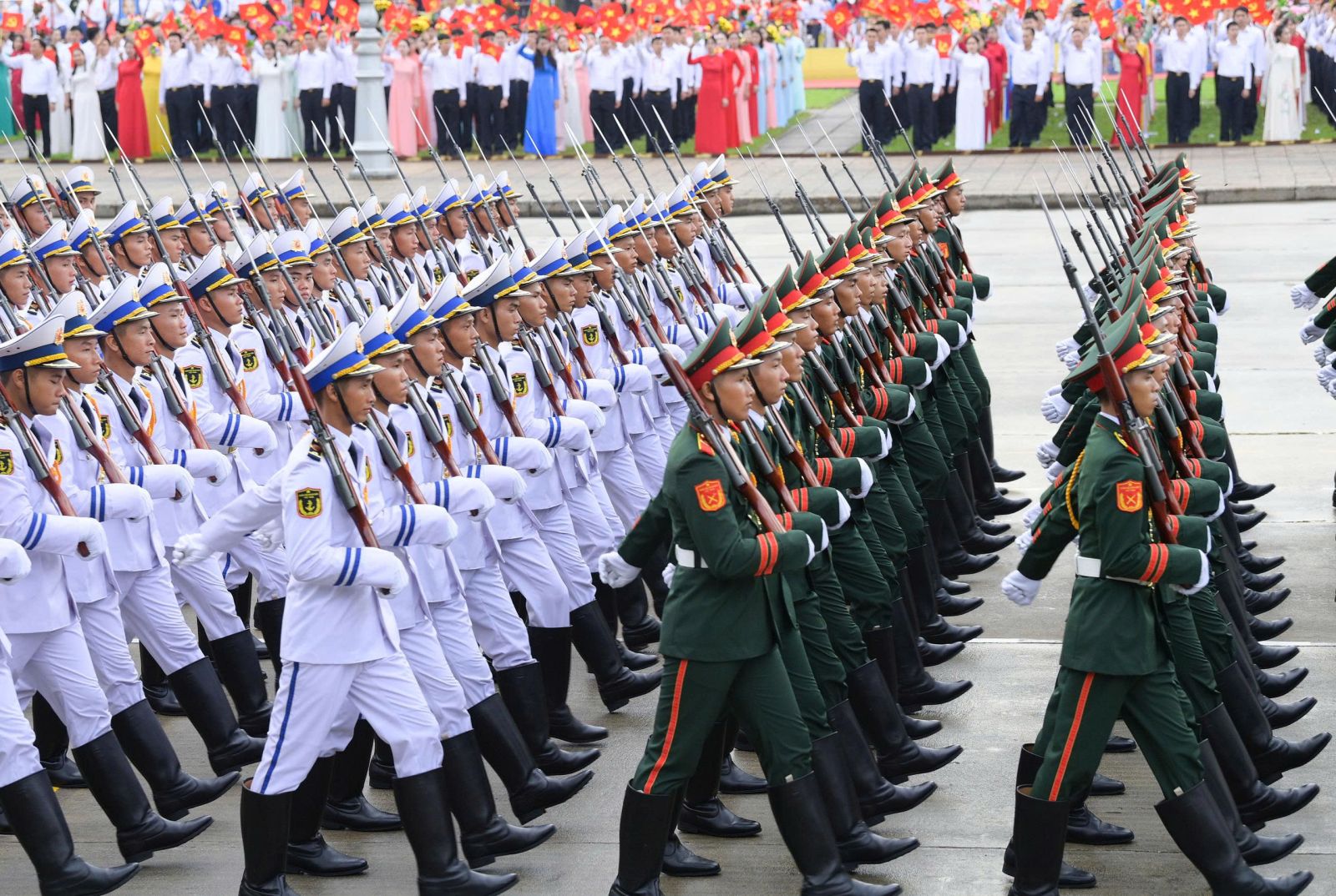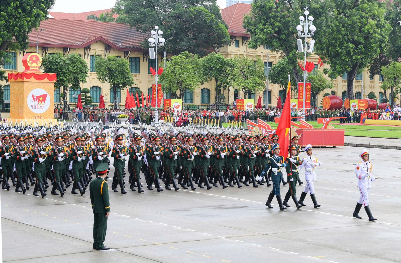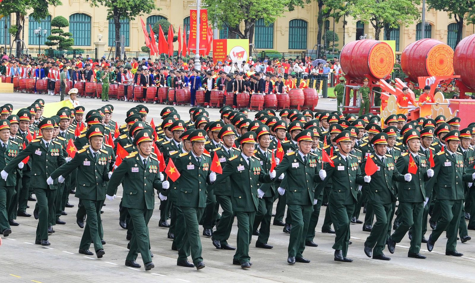 Tiếp đó, lần lượt các khối diễu binh, diễu hành tiến qua lễ đài Quảng trường Ba Đình. Khối quân đội có sự tham gia của: Khối danh dự ba quân chủng; Khối nữ Quân nhạc; Khối Sĩ quan Lục quân; Khối Sĩ quan Hải quân; Khối Sĩ quan Phòng không - Không quân; Khối Sĩ quan Biên phòng; Khối Sĩ quan Cảnh sát biển Việt Nam; Khối sĩ quan Hậu cần, Kỹ thuật, Công nghiệp quốc phòng; Khối nữ sĩ quan Quân y; Khối học viên các học viện nhà trường Quân đội; Khối chiến sĩ Tác chiến điện tử; Khối chiến sĩ đặc nhiệm dù; Khối lực lượng tác chiến không gian mạng; Khối nữ gìn giữ hoà bình Việt Nam; Khối chiến sĩ Tăng thiết giáp; Khối chiến sỹ Pháo binh – Tên lửa; Khối chiến sĩ Đặc công; Khối nữ chiến sĩ Biệt động; Khối chiến sĩ Công binh; Khối nữ chiến sĩ Thông tin; Khối chiến sĩ Phòng hoá.