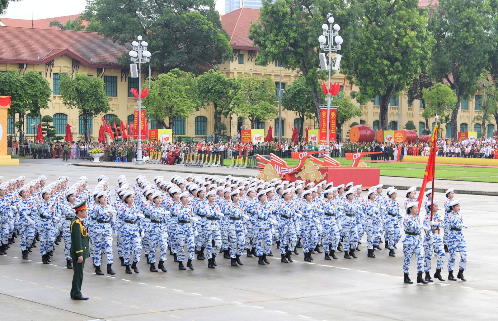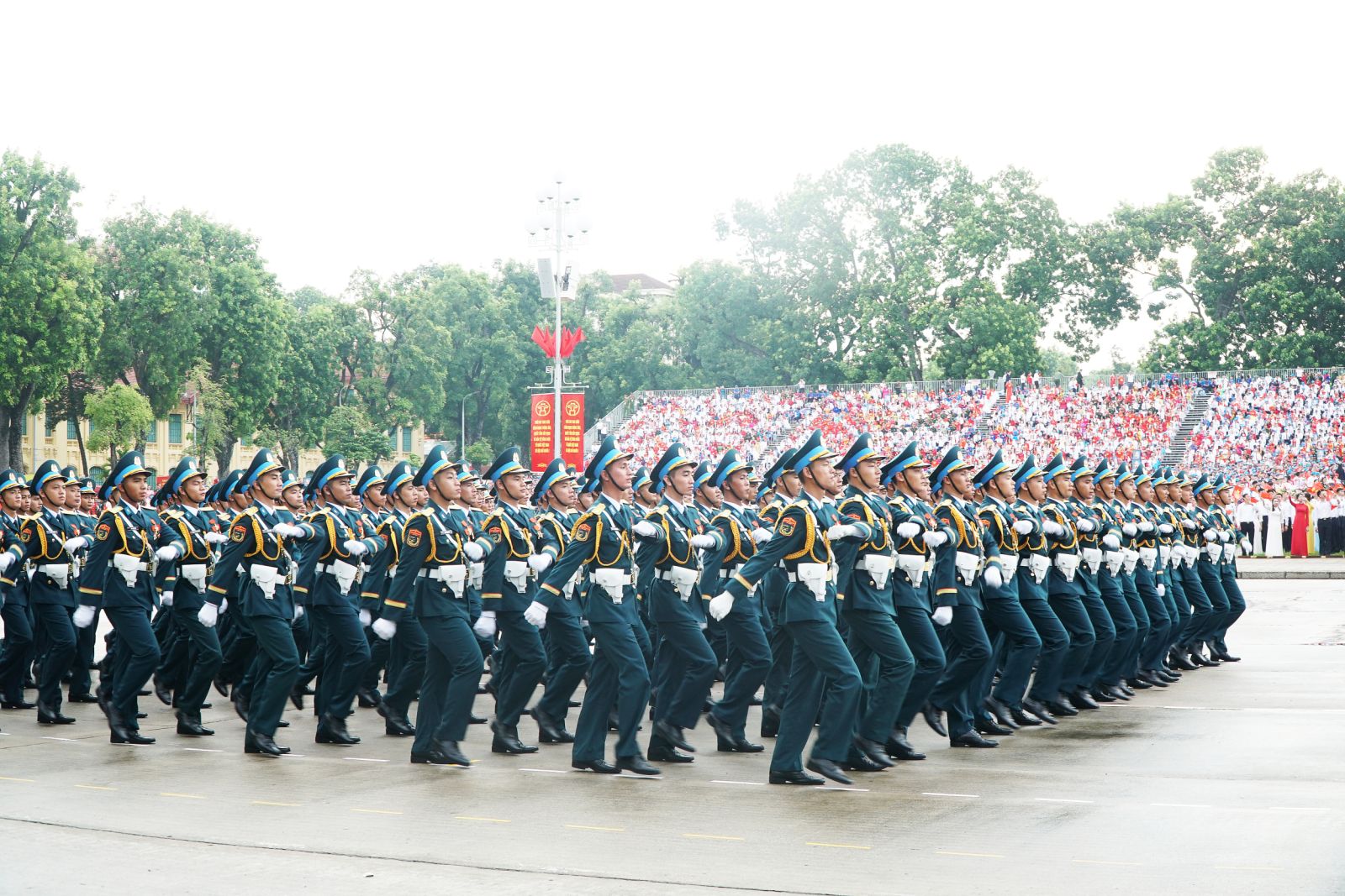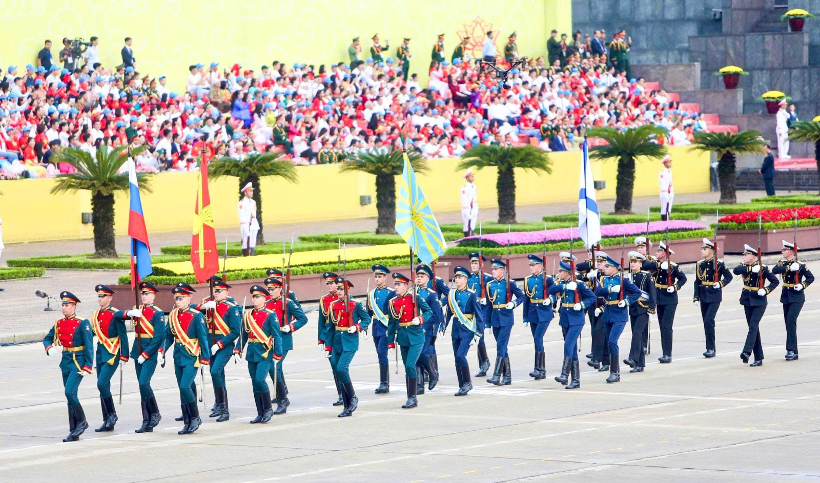 Tiếp đó, lần lượt các khối diễu binh, diễu hành tiến qua lễ đài Quảng trường Ba Đình. Khối quân đội có sự tham gia của: Khối danh dự ba quân chủng; Khối nữ Quân nhạc; Khối Sĩ quan Lục quân; Khối Sĩ quan Hải quân; Khối Sĩ quan Phòng không - Không quân; Khối Sĩ quan Biên phòng; Khối Sĩ quan Cảnh sát biển Việt Nam; Khối sĩ quan Hậu cần, Kỹ thuật, Công nghiệp quốc phòng; Khối nữ sĩ quan Quân y; Khối học viên các học viện nhà trường Quân đội; Khối chiến sĩ Tác chiến điện tử; Khối chiến sĩ đặc nhiệm dù; Khối lực lượng tác chiến không gian mạng; Khối nữ gìn giữ hoà bình Việt Nam; Khối chiến sĩ Tăng thiết giáp; Khối chiến sỹ Pháo binh – Tên lửa; Khối chiến sĩ Đặc công; Khối nữ chiến sĩ Biệt động; Khối chiến sĩ Công binh; Khối nữ chiến sĩ Thông tin; Khối chiến sĩ Phòng hoá.