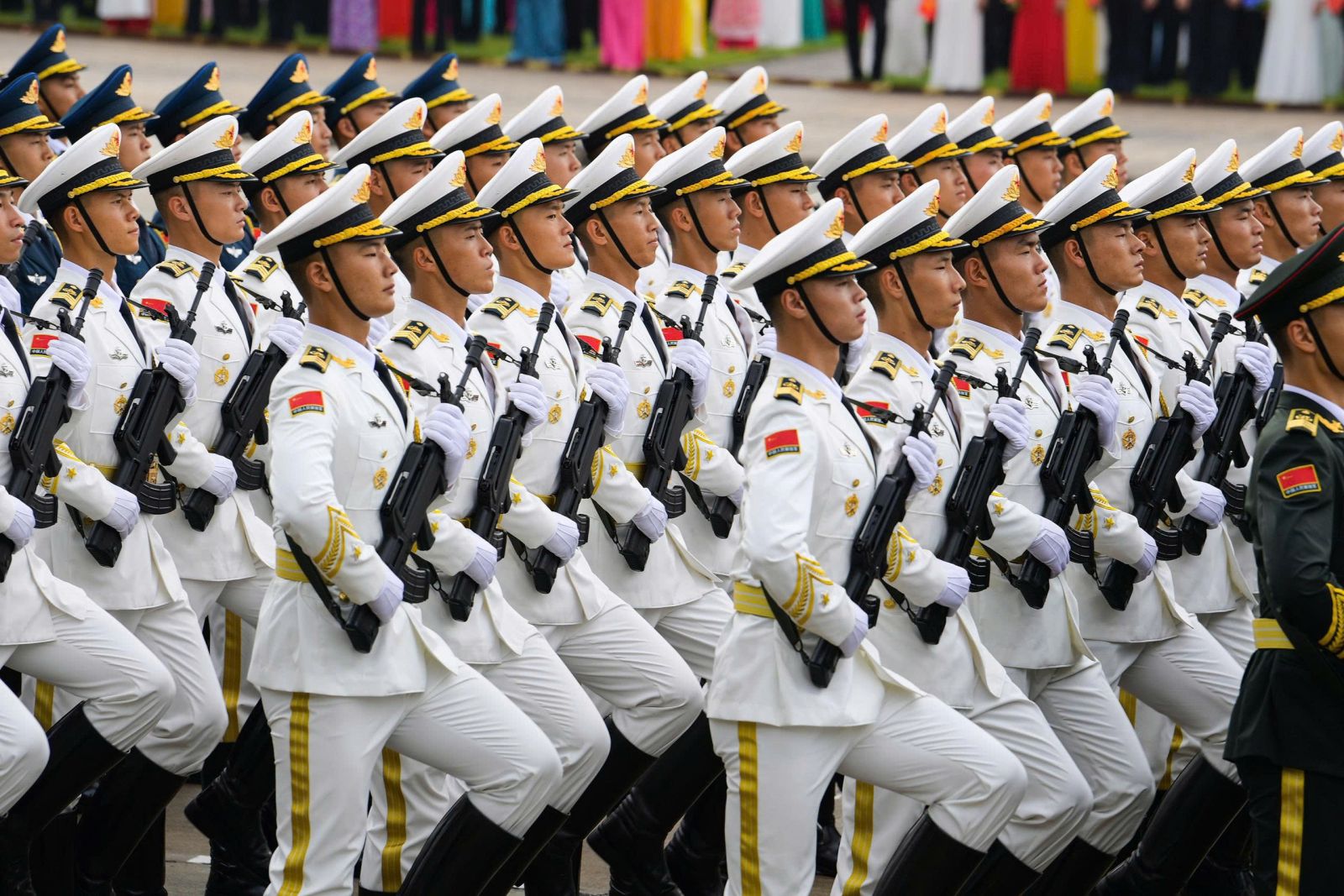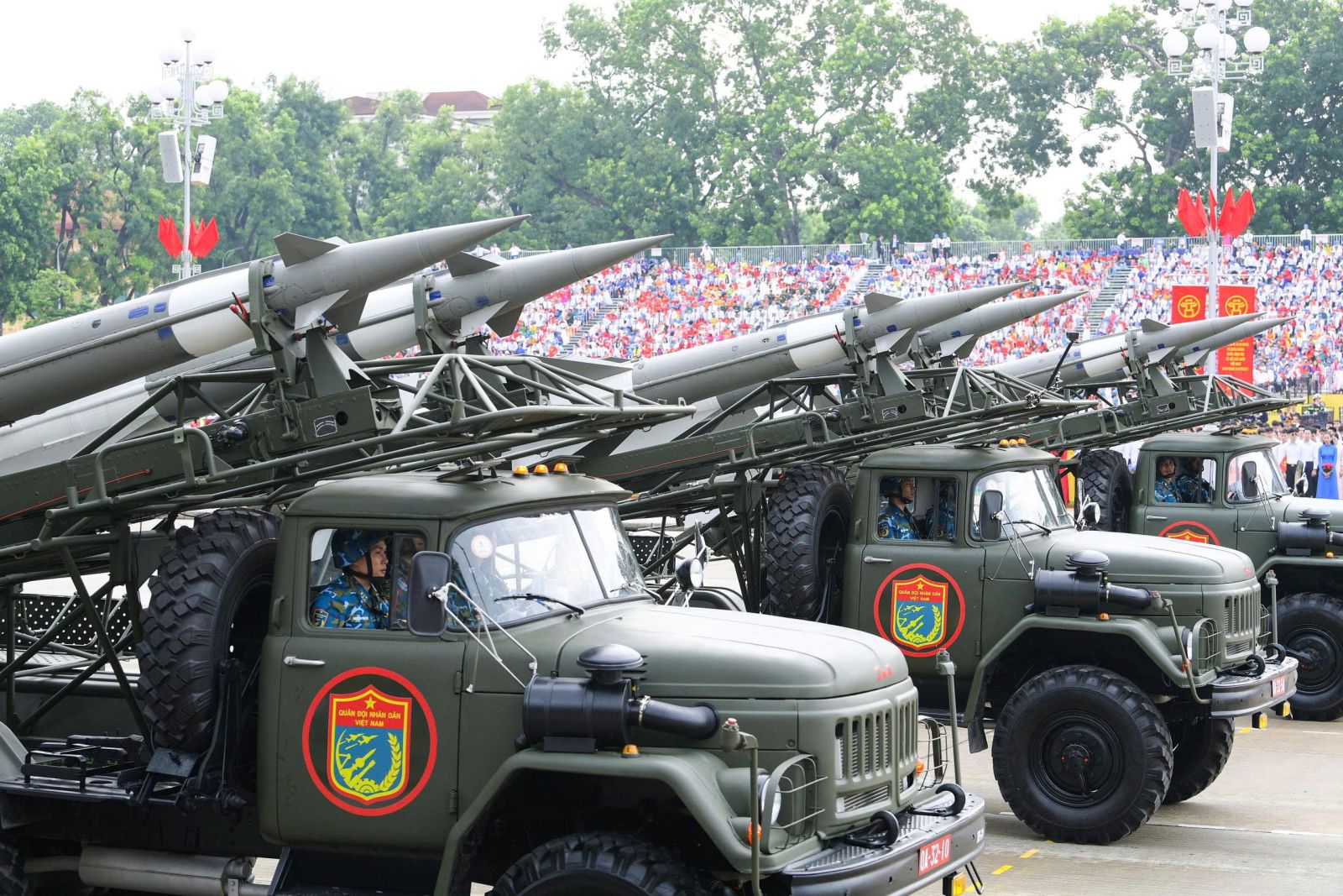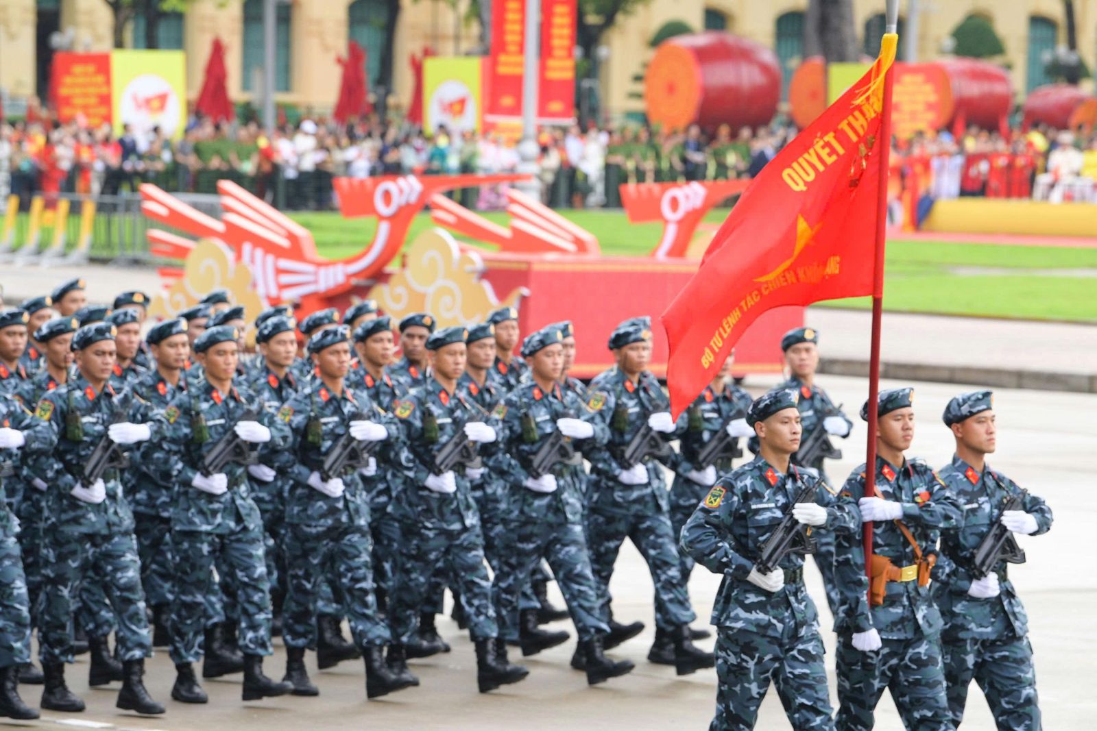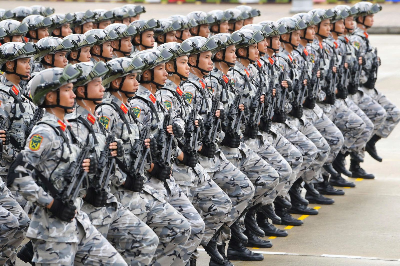 Tiếp đó, lần lượt các khối diễu binh, diễu hành tiến qua lễ đài Quảng trường Ba Đình. Khối quân đội có sự tham gia của: Khối danh dự ba quân chủng; Khối nữ Quân nhạc; Khối Sĩ quan Lục quân; Khối Sĩ quan Hải quân; Khối Sĩ quan Phòng không - Không quân; Khối Sĩ quan Biên phòng; Khối Sĩ quan Cảnh sát biển Việt Nam; Khối sĩ quan Hậu cần, Kỹ thuật, Công nghiệp quốc phòng; Khối nữ sĩ quan Quân y; Khối học viên các học viện nhà trường Quân đội; Khối chiến sĩ Tác chiến điện tử; Khối chiến sĩ đặc nhiệm dù; Khối lực lượng tác chiến không gian mạng; Khối nữ gìn giữ hoà bình Việt Nam; Khối chiến sĩ Tăng thiết giáp; Khối chiến sỹ Pháo binh – Tên lửa; Khối chiến sĩ Đặc công; Khối nữ chiến sĩ Biệt động; Khối chiến sĩ Công binh; Khối nữ chiến sĩ Thông tin; Khối chiến sĩ Phòng hoá.