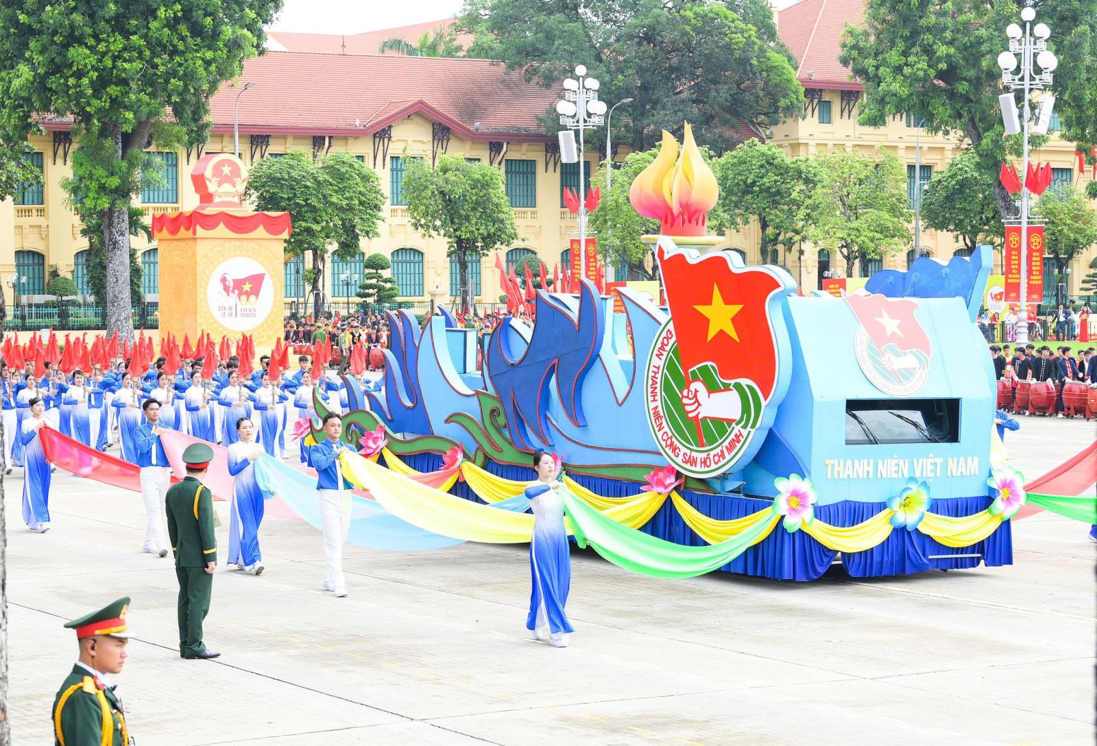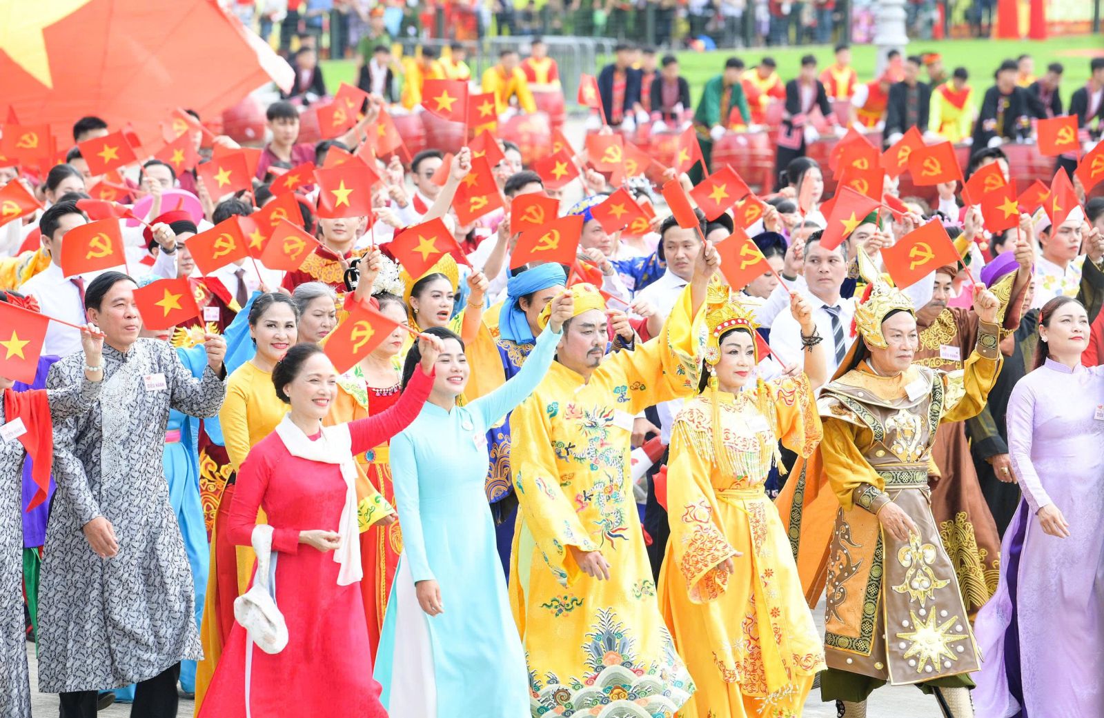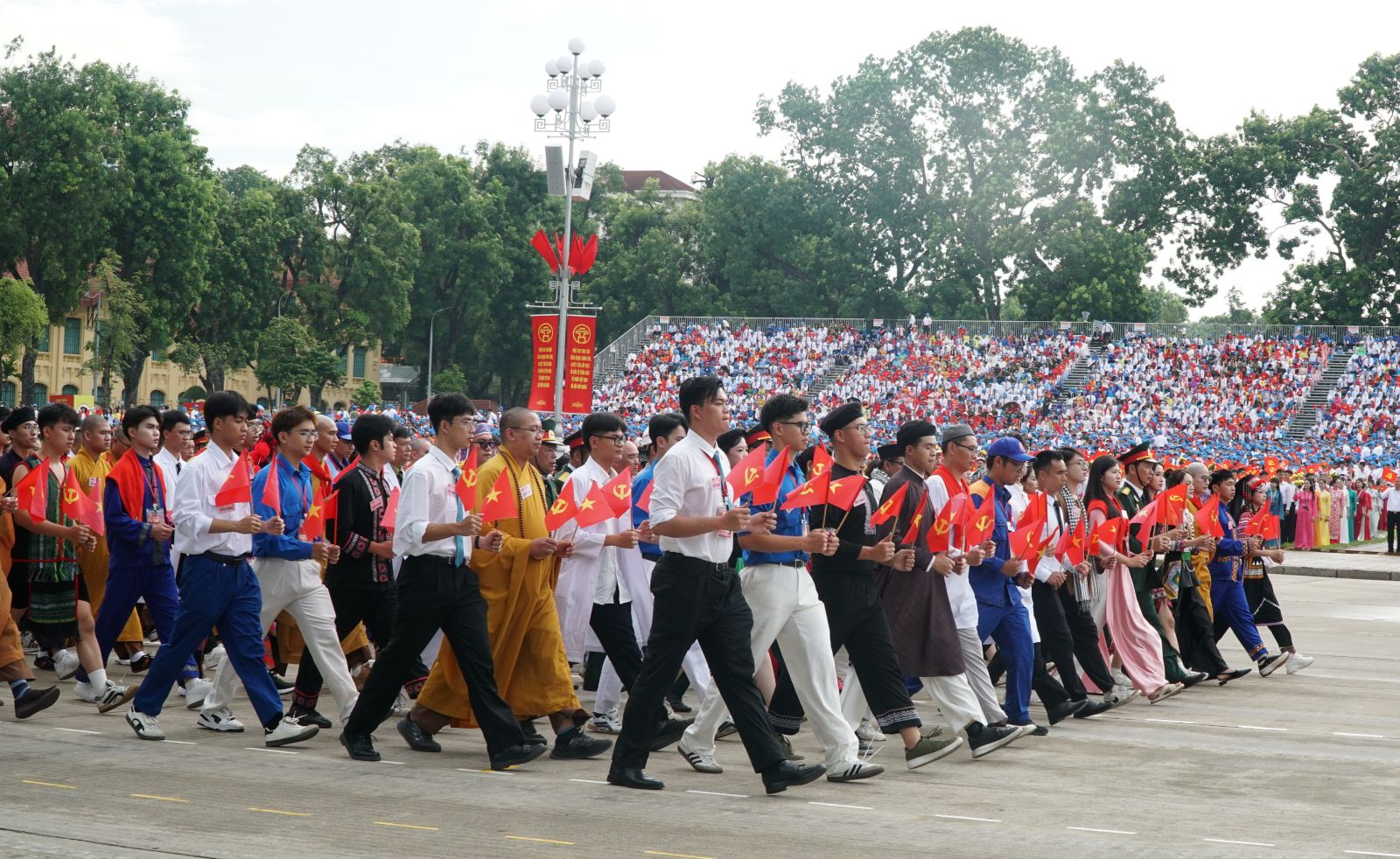 Tiếp sau các khối lực lượng vũ trang là khối Hồng kỳ mở đầu cho phần diễu hành của 12 khối quần chúng, trong đó, đi đầu là khối Mặt trận Tổ quốc Việt Nam và khối đại diện 54 dân tộc Việt Nam.