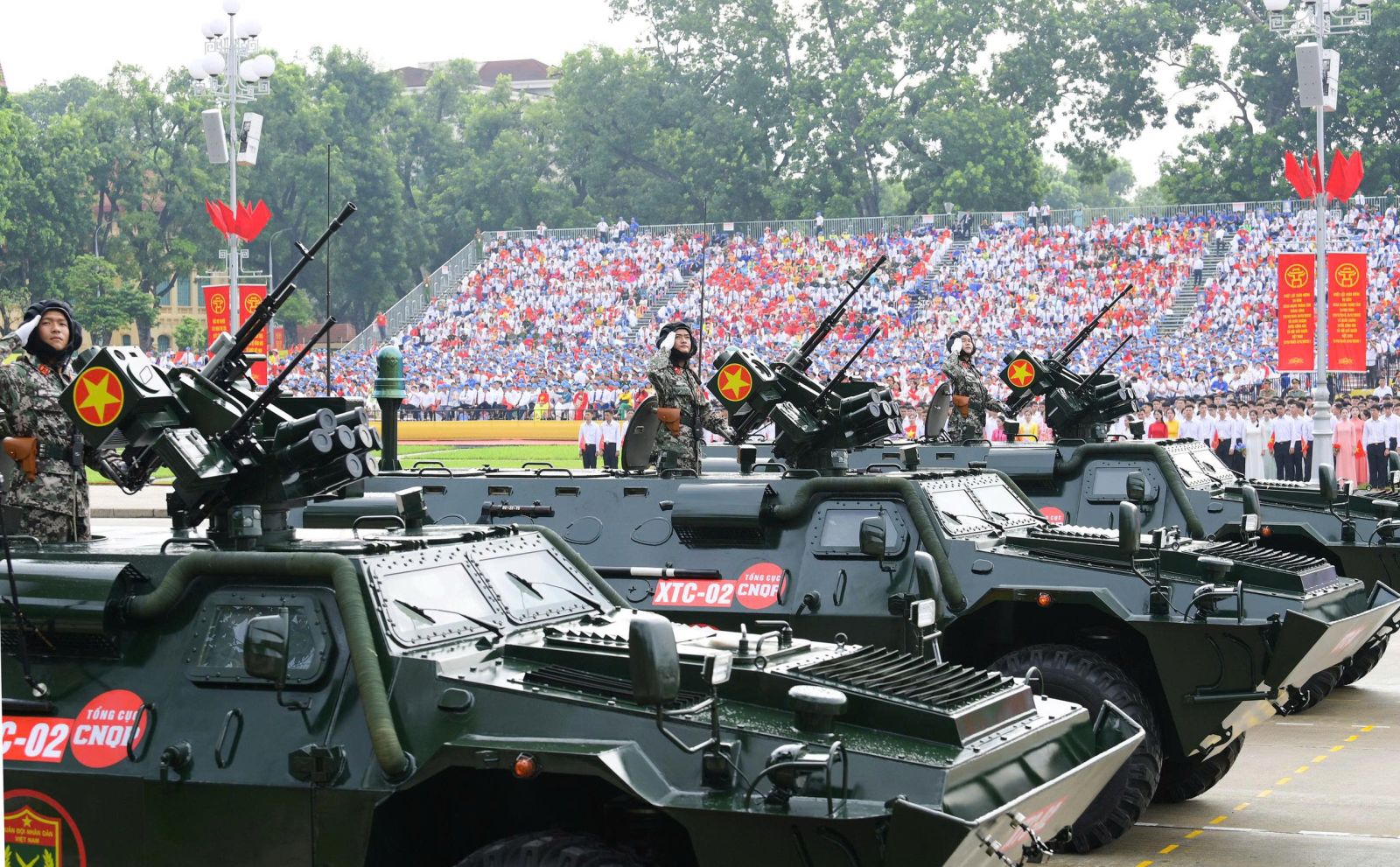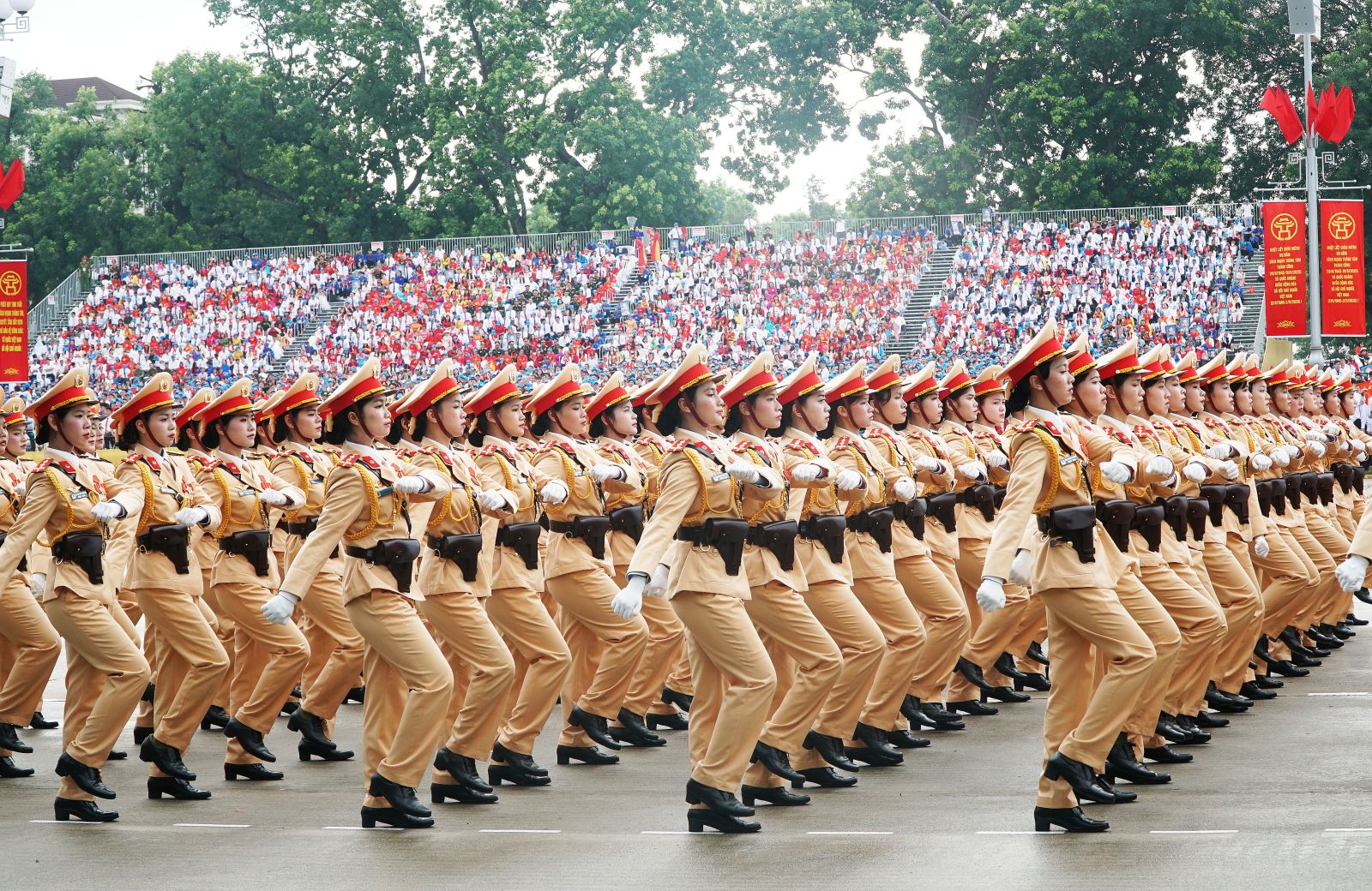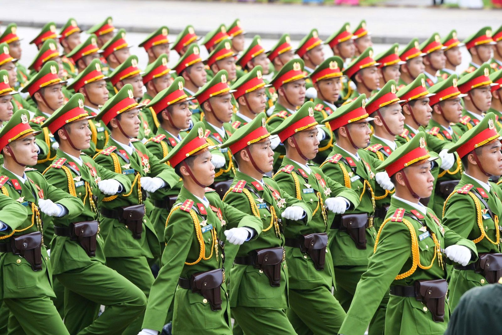 Tiếp đó là 14 khối xe, pháo quân sự; 9 khối xe đặc chủng công an. Cuối cùng là khối hồng kỳ và 12 khối quần chúng tham gia tổng duyệt.