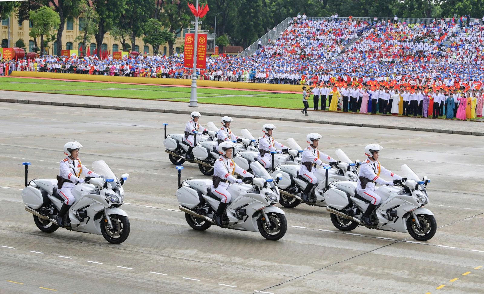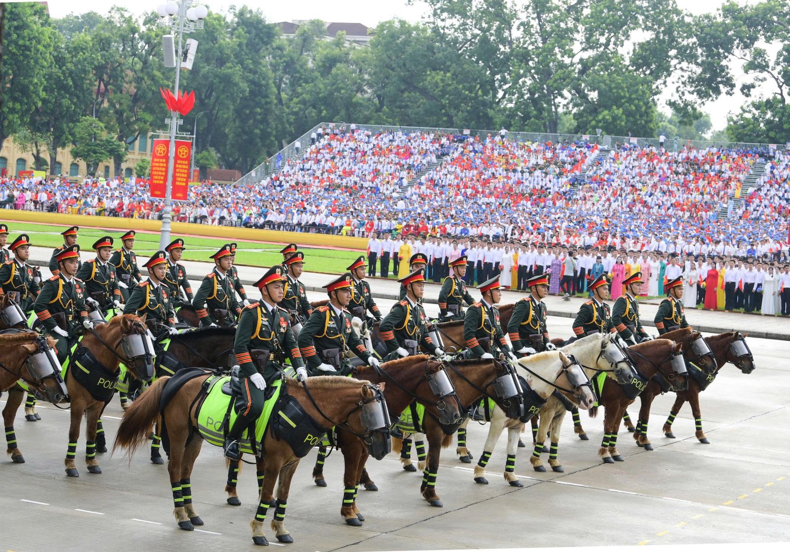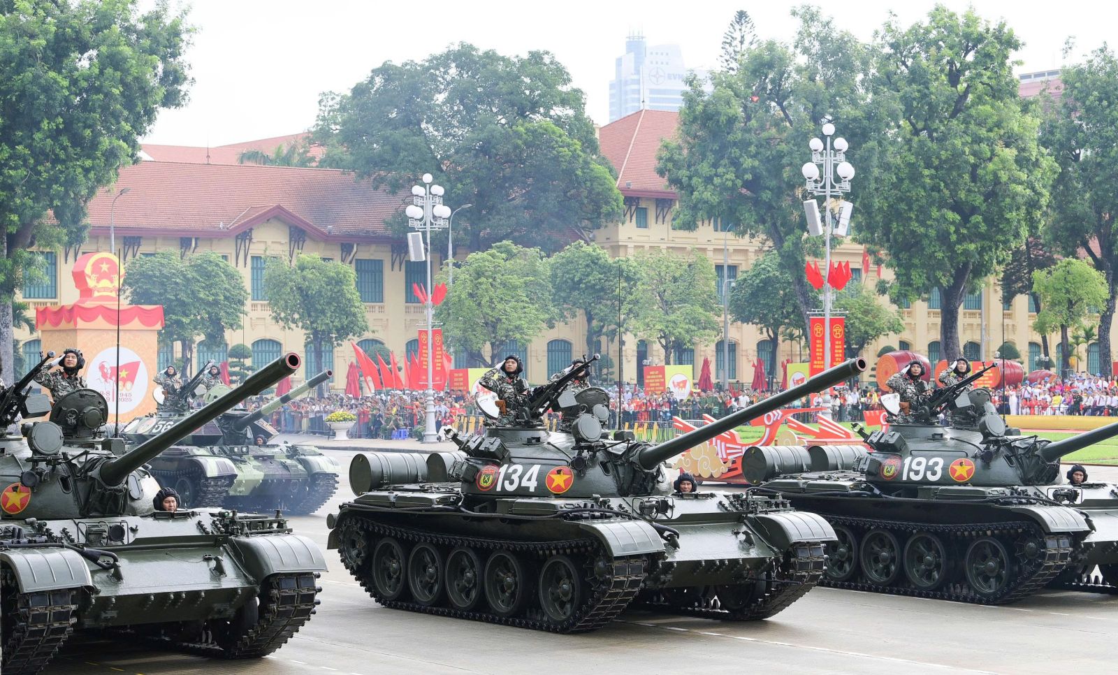Tiếp đó là 14 khối xe, pháo quân sự; 9 khối xe đặc chủng công an. Cuối cùng là khối hồng kỳ và 12 khối quần chúng tham gia tổng duyệt.