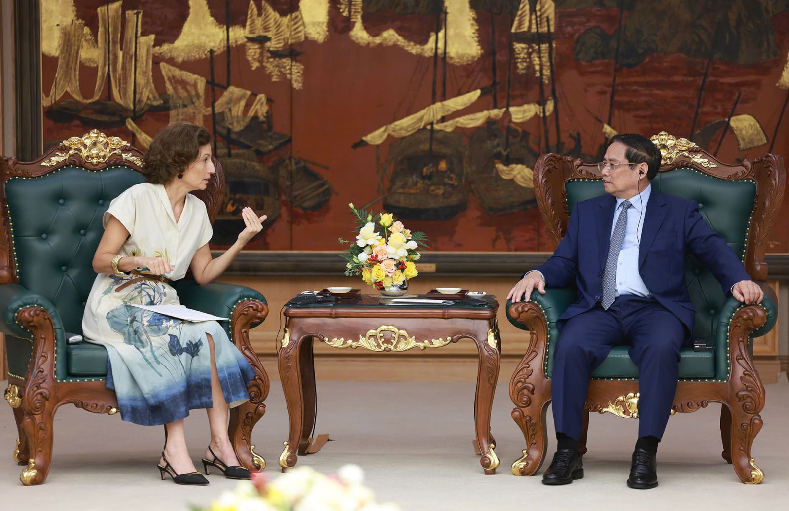 Thủ tướng bày tỏ vui mừng chứng kiến quan hệ Việt Nam – UNESCO ngày càng bền chặt, đi vào chiều sâu, hiểu biết của nhân dân Việt Nam về UNESCO ngày càng sâu sắc; 72 danh hiệu được UNESCO ghi danh là thương hiệu quốc gia rất quan trọng đóng góp cho công cuộc phát triển kinh tế - xã hội bền vững của đất nước; cam kết Việt Nam đã và sẽ tiếp tục đóng góp ngày càng tích cực, hiệu quả, nhất là trên vai trò tại các cơ chế điều hành then chốt của UNESCO. Thủ tướng cảm ơn UNESCO, đặc biệt là cá nhân bà Tổng Giám đốc vì những đóng góp cho thúc đẩy quan hệ đối tác Việt Nam - UNESCO trong suốt 2 nhiệm kỳ vừa qua.