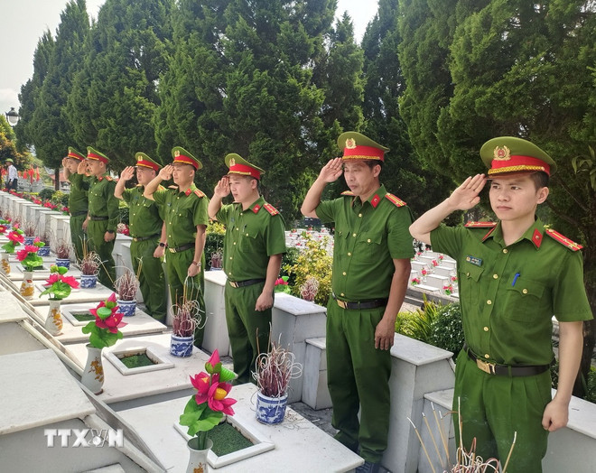 Lực lượng Công an tỉnh Tuyên Quang viếng, dâng hương tại Nghĩa Trang Liệt sỹ Vị Xuyên. (Ảnh: Đức Thọ/TTXVN)