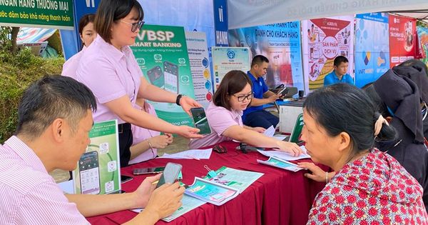 | Cán bộ Ngân hàng CSXH hỗ trợ khách hàng cài đặt ứng dụng VBSP Smart Banking. |
