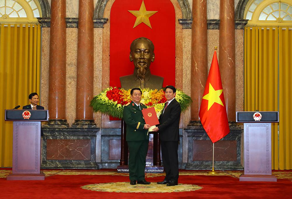 Chủ tịch nước Lương Cường trao Quyết định bổ nhiệm chức vụ Chủ nhiệm Tổng cục Chính trị QĐND Việt Nam và trao Quyết định thăng quân hàm cấp Đại tướng đối với đồng chí Nguyễn Trọng Nghĩa.