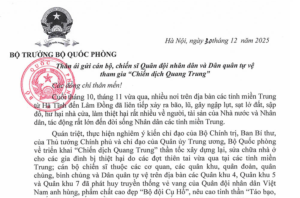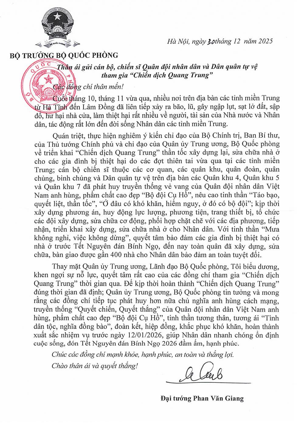 (Bqp.vn) - Ngày 30/12/2025, Đại tướng Phan Văn Văn Giang, Ủy viên Bộ Chính trị, Phó Bí thư Quân ủy Trung ương, Bộ trưởng Bộ Quốc phòng đã gửi thư động viên cán bộ, chiến sĩ Quân đội nhân dân và Dân quân tự vệ tham gia “Chiến dịch Quang Trung” thần tốc xây dựng lại, sửa chữa nhà ở cho các gia đình có nhà bị thiệt hại do các đợt thiên tai vừa qua tại các tỉnh miền Trung. Dưới đây là nội dung Thư của Đại tướng Phan Văn Giang.