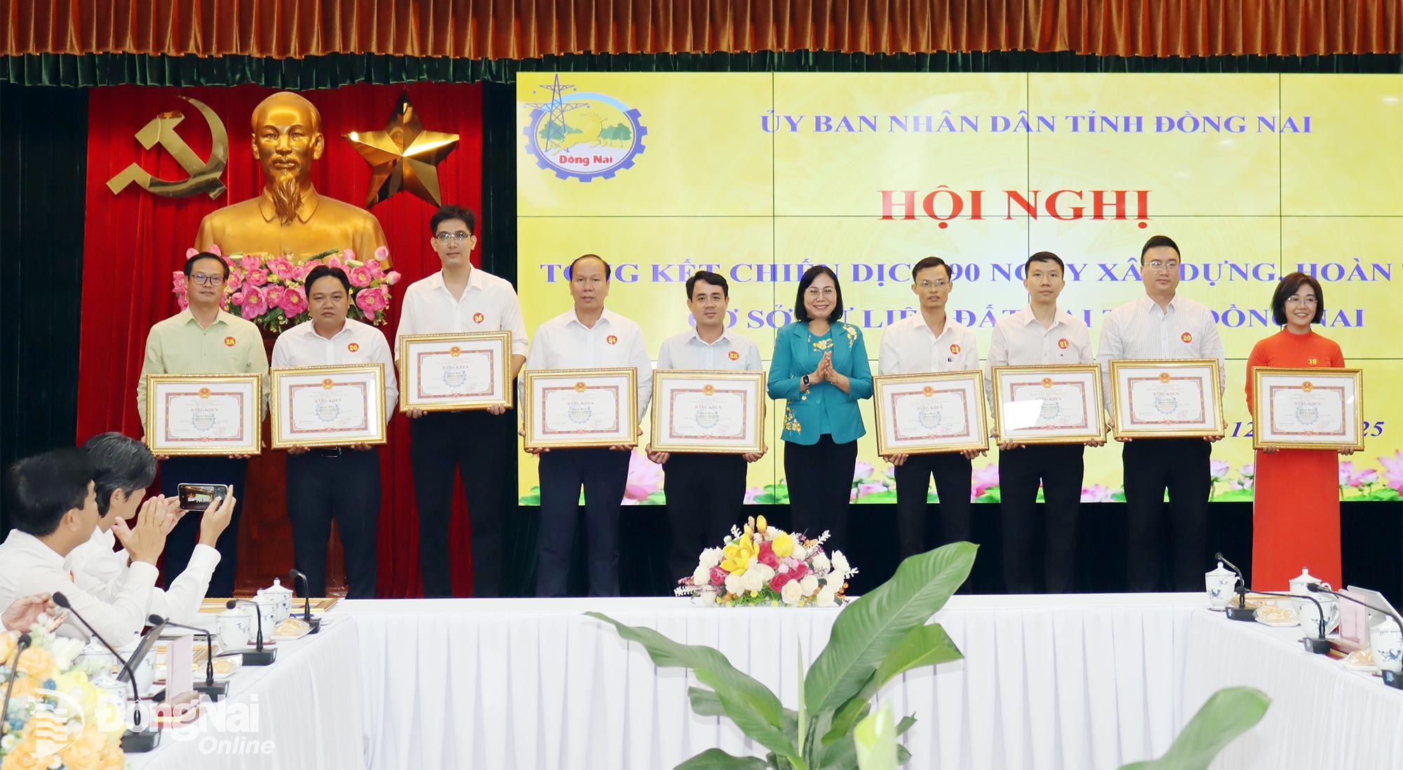 Tỉnh ủy viên, Phó Chủ tịch UBND tỉnh Đồng Nai Nguyễn Thị Hoàng trao bằng khen của UBND tỉnh cho các tập thể, cá nhân có thành tích xuất sắc trong thực hiện Chiến dịch 90 ngày làm giàu, làm sạch cơ sở dữ liệu đất đai. Ảnh: Hoàng Lộc